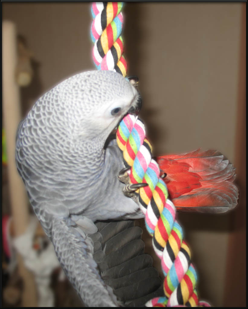 Крис любит висеть на цветной веревке-жгуте, что продают в зоомагазинах.