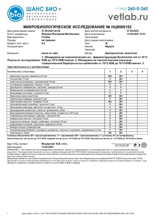 KatinPtic Опубликовано 14 сентября, 2023 Автор #24 Опубликовано 14 сентября, 2023 (изменено) 18 часов назад, Cabrera сказал: Как у Вас дела, готовы ли результаты анализов? Спасибо, что поинтересовалась! Вот сегодня пришли результаты - первая часть. 18 часов назад, Cabrera сказал: Как у Вас дела, готовы ли результаты анализов? @Zosia @Анна1972 @маленький принц Надо ли ципрофлоксацин продолжать? Вцелом , голубка слабеет... Я ее кормлю сама - распаренной пшеничкой и добавляю там немного то гречки, то немного перловки. Помет получается сформированный, крепкими колбасками. Очень сильный хлюп пошел изнутри, однако! Внутри клюва стало почище и это все в действительности похоже на скрытый трихомоноз. У тризомонозников с началом приема метрогила - на третий день действительно начинается сильный хлюп, потому что внутри начинают все эти наросты "таять". Помет стал с примесью, вообще с желтинкой, зеленинкой и всего по чуть-чуть - как обычно при лечении триха, когда "отходят" наросты. Видимо, у нее еще какое-то - я имею в виду - в какой-то высокой степени- воспаление зоба - она не может есть твердую пищу, ну так обычно при трихомонозе и бывает, как быть сейчас пока даже не знаю... Поэтому - кормлю пока сама распаренным зерном, возможно, буду вообще делать кашки-малашки из зерна, перемолотого в кофемолке. Ведь она в последнее время ела помет! Съедала "под чистую" все. Наверное, поэтому как раз и ела помет - что не может твердое "переработать". Ох... В прошлый раз были эти де эшерихии, только в еще большем количестве. В этот раз , если брать а/б - есть прям сейчас дома Цефтриаксон. Легко могу делать сразу сегодня, или подождать день? (Боюсь, что лишнего дня у нас сейчас нет). Про трихомоноз - это все только мои предположения, потому что я знаю, как там "бывает" , ну и еще- это может я притягиваю симптоматику к тому, что знаю и что мне понятно, ведь анализ мы на него не сдавали, могу сдать в другую лабораторию - шанс на трих не делает птицам анализ. Фото сделаю, конечно. Все выложу. Если это трихомоноз - почему ей не становится лучше? Мы уже неделю лечимся 😔 Изменено 14 сентября, 2023 пользователем KatinPtic 1