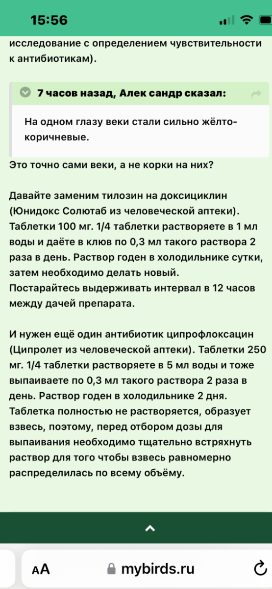 Cabrera Опубликовано 2 октября, 2023 #137 Опубликовано 2 октября, 2023 Я тоже советую оставить все как есть. Вы вытащили у птицы из глаза кусок гноя - это основание для применения доксициклина. По поводу ципрофлоксацина. Сейчас Вы даёте его в дозировке 40 мг/кг веса в сутки. Это стандартная дозировка. Я бы не стала ее уменьшать. Но птица Ваша, решать Вам. Если хотите, то можно посчитать какое количество раствора необходимо давать Варе исходя из дозировки 30 мг/кг веса в сутки, как написала С.А. Но имейте в виду, что используя такую дозировку есть большой риск не добить инфекцию. Ципрофлоксацин в этом случае повторно уже нельзя будет использовать т.к. бактерии, скорее всего, приобретут к нему устойчивость, а новую терапию без анализов подобрать будет очень сложно. 2