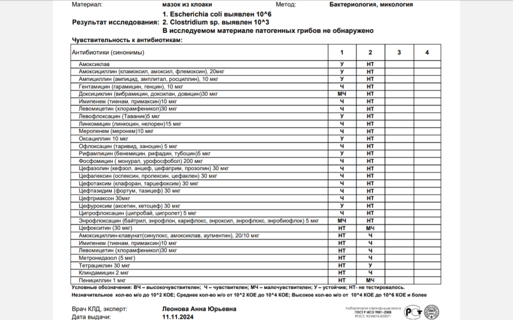 По анализам голубки ей подходит доксициклин и Ампициллин.