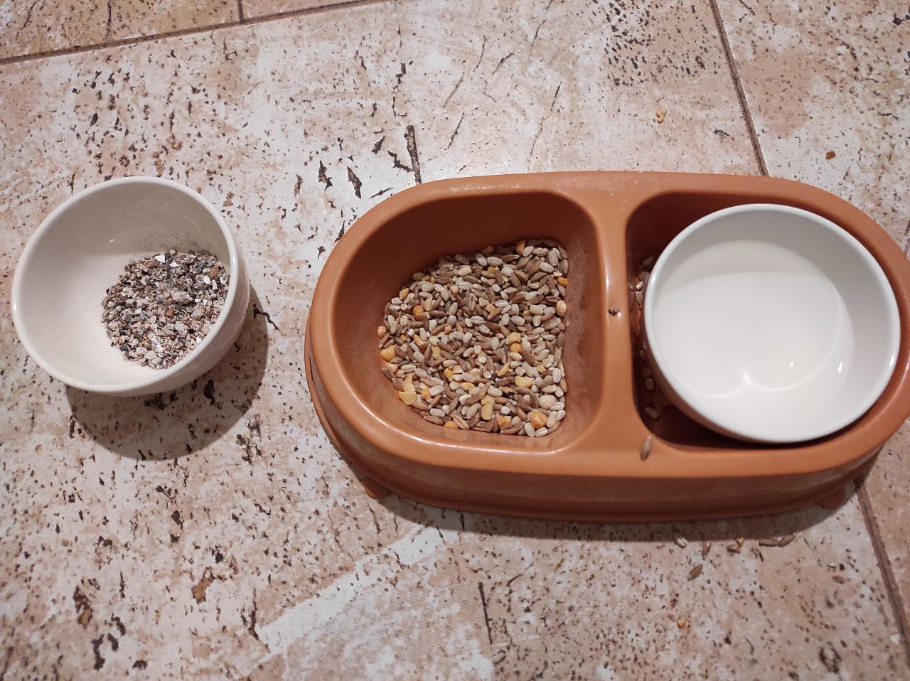Неделю кормили гречкой - малыш голодал. Первую нормальную кучу сделал, когда наелся проса из покупного корма. Но одним просом кормить плохо. А в той смеси ничего подходящего больше нет. Поэтому в четвёртый раз повторяю: пшеница+перловка.