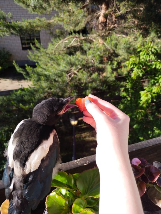 нью юзер Опубликовано 26 мая, 2024 #1 Опубликовано 26 мая, 2024 Здравствуйте! Никогда не думала, что зарегистрируюсь на этом форуме, но да ладно. Живу в частном доме. На днях выловили слетка сороки из бассейна. Неизвестно, сколько он пролежал там, но был еще жив и весь дрожал. Было раннее утро, мы просто посадили его на траву под соснами, чтобы к нему прилетели родители. Но он дрожал, и я решила его просушить тёплым воздухом (не из фена). Потом усадила его на ветку и из окон поглядывала, чтобы не приближались соседские кошки. Там он и просидел весь день. Только ко второй половине дня догадалась, что его нужно покормить. Выловила из газона каких-то жучков, их он не очень охотно клевал. Тогда быстро почитала, что, блин, едят сороки. Дала ему вареное куриное мясо (другого не было), кусочек яблока. На ночь придумала посадить его на крышу сарая, но он упал оттуда на ветку. (Еще не летает, только сверху вниз и недолго. Я учу!) Тогда я посадила его на подобие карниза под моим окном на втором этаже, там, где у меня цветочки стоят. Там он и спал всю ночь. На следующий день сделала для него гнездо, кормила проростками, курицей и клубникой. Стал меня узнавать и чирикать, когда видит, что я в окне приближаюсь. Рук не боится, любит гладиться. По нему бегают маленькие жучки-точки. Нормально ли это? Нужно ли обрабатывать от паразитов? Давать глистогон и тд? Я самостоятельно не хочу ничего давать, потому что: а) боюсь что наврежу, не рассчитаю дозу и отравлю гулю, б) он все-таки живет не в городе, может это нормально для "лесных" птиц? Также прошу сообщить, если я допустила какие-то ошибки в его кормлении! Постараюсь найти еще насекомых, знаю, это важно. Он чирикает, общается с другими сороками на деревьях. Лапки в порядке, когти острые, все руки мне подрал. Хочу поскорее научить его летать, чтобы он присоединился к своим сородичам-сорокычам.