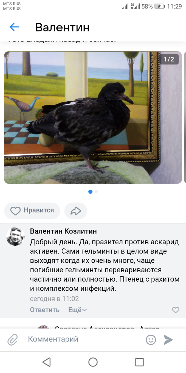 Жаль, что Светлана не опровергла то, что написала (сейчас наткнулась здесь случайно). Анисия не могла дозвониться до Светланы и попросила меня- спросить, будет Светлана забирать Давида или нет? ЭУ Светланы два номера, один с вотсаппом, второй нет. Светлана очень удивилась, узнав, что Давид ЖИВ и вылечен, забрала его , но потом снова вернула, т.к. он не ужился с новым голубенком как я поняла. Анисия выходила Давида и теперь он живет у нее в приюте, потому что кроме сложнейшего трихомоноза, который Анисия вычищала ювелирно - у него вертячка. Я сама бываю эмоциональна, но нужно было написать опровержение. Светлана плакала, когда я написала и она поняла что ошиблась. Она похоронила Давида заранее, не выяснив. Анисия бывает очень занята и очень устает.