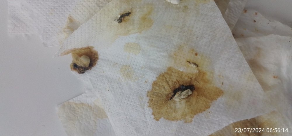 лиил Опубликовано 23 июля, 2024 Автор #35 Опубликовано 23 июля, 2024 Подскажите ещё пожалуйста. Вчера я их кормила тараканами. Сегодня у них вот такой помёт. До этого кормила сверчками и такое было только у одного стрижа и то редко. Ещё я когда застилаю им ведро, на дно сыплю ромашку от паразитов, а сверху салфетки . Может ли как то ромашка повлиять на цвет помета? Что мне делать?