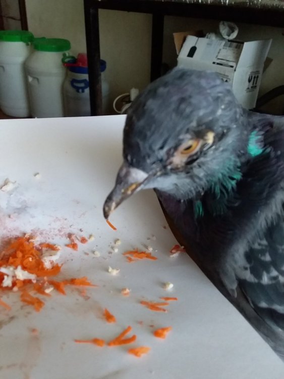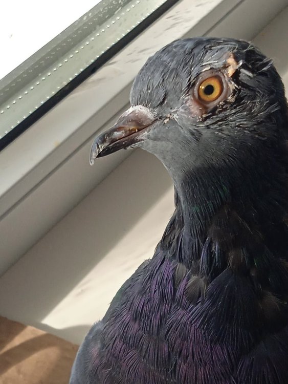 w1z Опубликовано 20 августа, 2024 #1 Опубликовано 20 августа, 2024 Здравствуйте. История вкратце: около двух месяцев назад был подобран полуголый птенец голубя около двух-трёх недель отроду. Есть сам не мог помет - густая темно-зеленая жижа. В уголках глаз белые твердые нагноения. На лапах и, со временем, на клюве выросли оспенные шишки. Вес - меньше 150 грамм. Кормился кашей насильно 4 раза в день пропили байтрил + Флуконазол 14 дней, ушел понос, начал сам есть. Промывали глаза мирамистином и ромашкой вынули нагноения вроде бы прошло. Обнаружил с утра срыгивание прозрачно-желтой слизи, пропили формазин50 двадцать один день - ушла слизь. Мазали фукорцином оспины на лапах и пили разбавленную перекись - ушла оспа (клюв пока полностью не восстановился) Сейчас зверь оперившийся, почти перелинявший, судя по повадках самец, кушает проросшую пшеницу и яйцо, готовится к вылету в самостоятельную жизнь. Но есть один момент с чем не знаю как быть: снова выросла шишка возле левого глаза. Глаз чистый ясный но слегка слезиться по причине нароста. Дыхание чистое соплей нет. Недели три назад прокапали три дня Левомицетин капли - без особых успехов. Сейчас четвертый день капаем Ципрофлоксацин (хотя вроде как рекомендуется не более трёх) улучшений пока нет (во всяком случае радикальных, может чуть меньше слезиться глаз). На фото сверху над глазом слипшиеся перья от слез и прошлого гноя (пока не перелинял) Подскажите пожалуйста как быть скоро осень и до холодов надо бы найти стаю и социализироваться... Заранее спасибо за ответ. 1