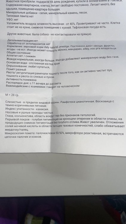 Вчера были на приеме у орнитолога, в Тбилиси. К сожалению, сказали очень печальный прогноз. Вес птицы всего лишь 28 грамм, критический. Сделали рентген, узи. Обнаружили кистообразную опухоль, начало подагры. Прикреплю вам файлы. И диагноз врача. Если вам не сложно, ознакомьтесь, пожалуйста. Сказали только обезбаливать анальгином. Больше никакого лечения. Даже предлагали усыпить, так как птица может испытывать боли, но  рука не поднялась. Скажите, пожалуйста, насколько верен диагноз и настолько ли все плачевно или есть какие-то альтернативные варианты лечения? И можно что-то попробовать. Птица клюет шелушит зерна, но не ест. Пытаемся насильно кормить кашей. Отправили домой доживать свои дни. Не назначили никакого лечения, так как вес птицы очень мал. Также сказали не кормить насильно. Но я все де думаю, что опускать руки еще рано и может как-то можно набрать вес, чтобы провести лечение. Ведь подагру можно поддерживать , пока она не распространилась на органы. С каждым днем птице становится хуже.  Прикрепляю диагноз врача и снимки рентгена. Спасибо
