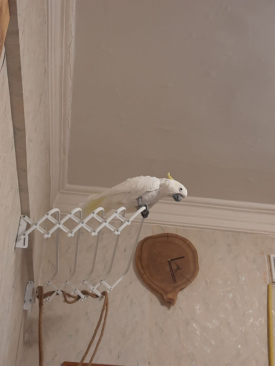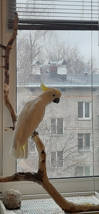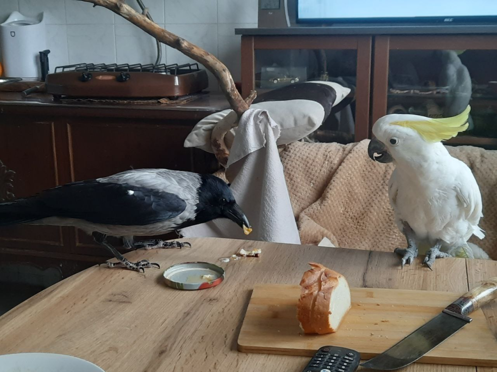 Jinn Опубликовано 2 февраля Автор #6 Опубликовано 2 февраля Как это было, когда принес ворону в дом - попытка изолировать ворону в транспортную клетку попугая не удалась - попугай (какаду Гоша, тридцати двух лет от роду) слетел на клетку, ворона тут-же клюнула Гошку в пятку, Гошка заорал, и запрыгнул на мое плечо с возмущенными криками - Что ты притащил?! Убери отсюда эту гадость!! Ворона от таких событий начала биться в клетке, крылья застревали между прутьями, выворачиваясь чуть не на изнанку... Клетку пришлось отменить. Октябрь Повреждений у вороны оказалось немало - травма правого крыла, травмы запястья, локтя и бедренного сустава левой лапы. Месяц ворона лежала на больном крыле, на боку, вытянув в сторону поломанную лапу. Еду брала из рук. Молчала. Попугай, после первого знакомства, интереса к вороне не проявлял. Потихоньку ворона начала привставать и сидеть на одной здоровой лапе, выставив вперед больную, опирая ее на локоть. Все это время ворону приходилось кормить с рук, поднося ей еду к кончику клюва. А когда ворона попыталась брать еду самостоятельно, оказалось, что у нее сильная ЧМТ - нарушена координация движений, возможность оценки расстояния до еды и способность попасть клювом в кусочки пищи. Попытки встать и сделать шаг заканчивались падением на бок. Но ворона не сдавалась - клала боком голову на пол, открывала пошире клюв и двигая им вперед-назад и в стороны, умудрялась захватывать еду. Ноябрь. Ворона получила имя - Ворона и начала потихоньку выходить из-под лавки, осматриваться и передвигаться, прыгая на одной здоровой лапе. К концу ноября у Вороны восстановилась координация и способность попадать клювом в кусочки еды с первой попытки. Утренний завтрак - кусочки фарша и креветка. Декабрь. Ворона решилась сменить ярус обитания и перебралась из-под лавки на пуфик под кухонным столом. Дни были посвящены бесконечным прыжкам по полу кухни, вспархиванию с пола на пуфик, перескакиванию с пуфика на скамейку и устройству потайных нычек с кусочками еды в самых неожиданных местах. А еще ворона начала купаться в мелком тазике. Гоша уступил Вороне пуфик под столом - второй по высоте (после пола) ярус кухни. С пуфика Ворона начала отвоевывать ротанговый диванчик у собаки. И отвоевала. Следующим по высоте ярусом, который освоила Ворона, стал подоконник и стол. С освоением Вороной стола начался этап конфликта интересов Гошки и Вороны и борьба за место под люстрой на кухне. Гошка, до поры, безропотно сдавал позиции. Гошка обиделся на вот это вот все... Еще в октябре Ворона сбросила из раненного крыла три поломанных пера, к декабрю отрастила их заново и начала порхать по кухне легко, как бабочка, попутно приглядываясь к следующему по высоте ярусу - к Гошкиной вольере... Путей к отступлению у попугая уже не оставалось и под потолком кухни была повешена сушилка для белья: Ну и вот... За все время вороньей экспансии с птиц не упало ни одного перышка. Суть конфликта была в инициативе Вороны подружиться с Гошкой. Ворона подсаживалась к попугаю, принимала позы подчинения, опуская свою голову к его лапам и тихонько каркала оттуда - Давай уже дружить, наконец... Гошка на эти приставания сначала молча отодвигался, затем начал кричать на Ворону - Отстань, животное! А если ворона продолжала настаивать, либо улетал от нее, либо прогонял. Фехтование на клювах носило и