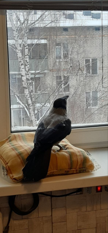 Jinn Опубликовано 27 ноября, 2024 #1 Опубликовано 27 ноября, 2024 Подобрали на улице травмированную ворону - крыло висело, левая лапа сломана в двух суставах, сильный сотряс - ходить толком не могла, стоять не могла - заваливалась на бок, клювом в еду попадала с пятой попытки, месяц лежала на кухне под лавкой на одном боку... Отлежалась, лапа почти починилась, крыло уже не висит (четыре поврежденных маховых пера сброшены и растут новые). На улицу возвращаться не хочет. Теперь вот так живем: 2