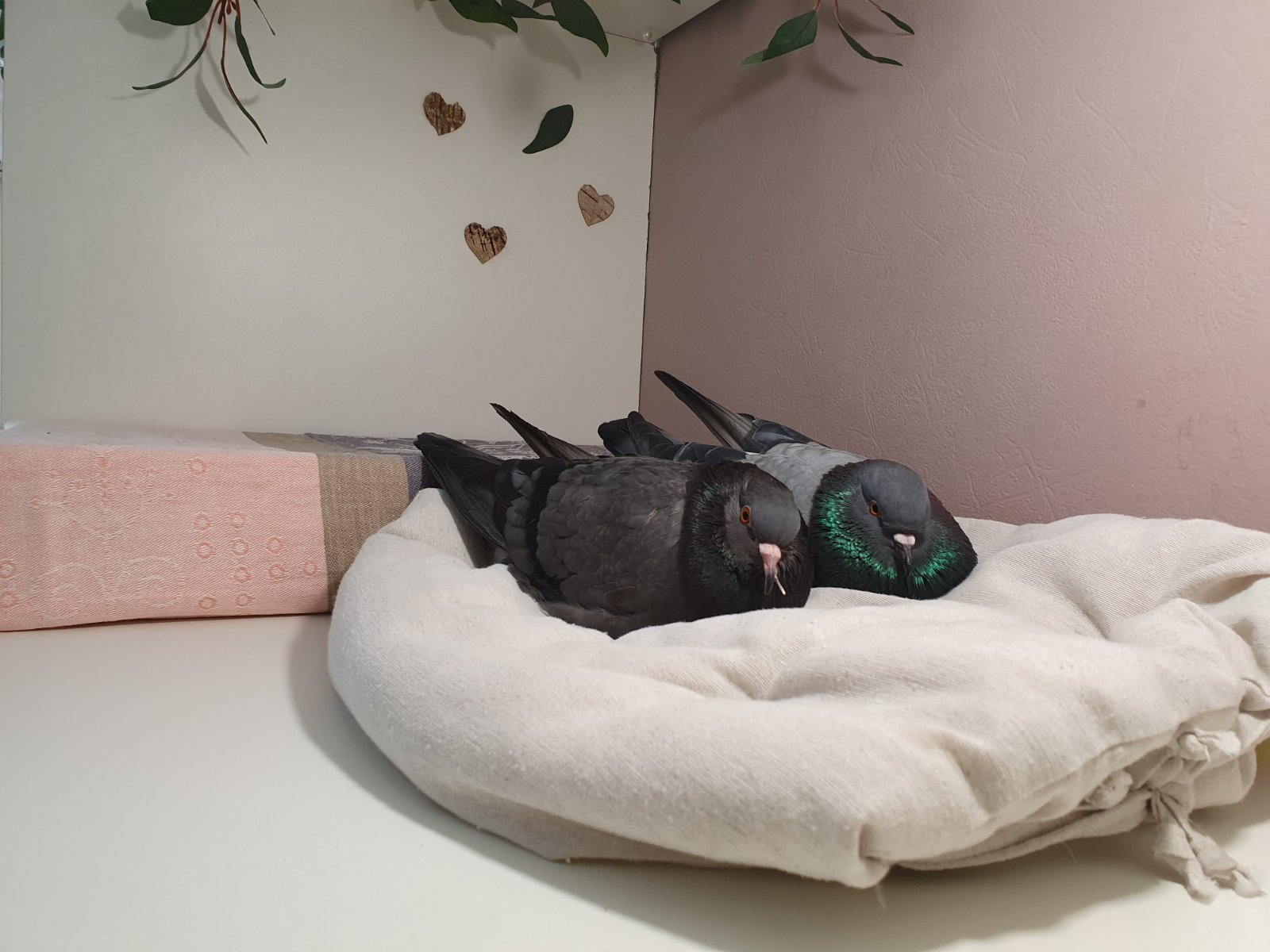 А мои вот на фото :). Очень удивительная история произошла. Я видела, как самцу одиноко, и у него депрессия настоящая началась. Я на улице искала - может, где будет голубка травмированная? Но нигде не было. Ну я тогда подумала, что только Бог поможет. И стала просить у Бога помочь найти моему голубю пару. Проходит время, и вот иду по улице. И вдруг от стаи голубей вдали отделяется один голубь, и бежит ко мне со всех ног. Прибежал, сел на мой кроссовок, и сидит, смотрит мне в глаза. Я не поняла юмора - с кроссовка его аккуратно убрала. Собралась уходить, а он снова на кроссовок сел, и не хочет уходить. Тогда я взяла его в руки, увидела крайнюю степень истощения и признаки вертячки. Забрала домой, продержала месяц на карантине, и посадила к самцу. И только тогда поняла по поведению самца, что это самка :). Бог услышал молитвы. Так и живут у меня душа в душу.