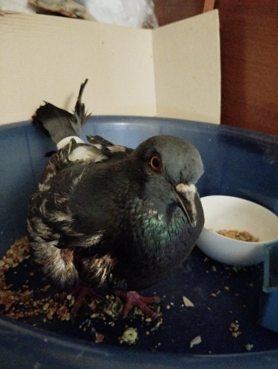 Patata Опубликовано 7 января, 2025 #1 Опубликовано 7 января, 2025 Здравствуйте. Всех с Праздником Рождества Христова! Вчера подобрала голубя, ходил по тротуару, прямо под фонарями. Для меня было странно видеть птицу , гуляющую в потемках. Подобрав его, увидела , что провисает правое крыло. Вчера промыла марганцовкой и обработала мазью Левосин, а сегодня увидела, что степень поражения намного больше. Когда ловила, он был намного бодрее, как принесла домой и посадила в тазик, птицу ,, развезло,, на глазах. Не наблюдаю, чтобы пил и ел самостоятельно. Воду вливаю из шприца (сняв предварительно иглу). Активность не проявляет, сидит, уставившись, в одну точку. Прошу дать советы, чтобы помочь птице. Проблема еще в том, что крыло так висит, что он по нему топчется, а чем закрепить к тельцу, на ум ничего не приходит. Скотч!?