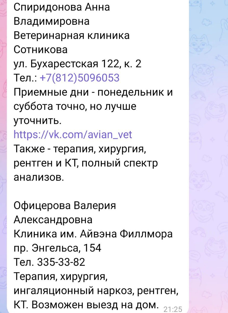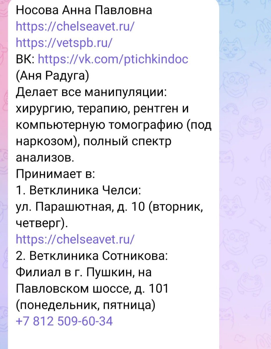 Delfin Опубликовано 27 февраля, 2025 #2 Опубликовано 27 февраля, 2025 я не врач,нопохоже на рвоту-перо вокруг морды слипшееся+ноздри грязные.Срочно отмыть птицу! рвота или может сама мазь в глаза попала.Отмыть,в глаза закапать глазной антисептик альбуцид или окомистин или фурацилин (полтабл на стакан гьрячей воды).Возмите лупу и осмотрите глаза,возможно придется показатьофталмологу-хоть человеческому или ветеринару(глаза у всех одинаковые!). Питер!!у вас есть лучшие врачи страны-у вас ив Москве! я бы обратилась туда!Вигдорова из чижикпыжык -оч хорошая. вот тут еще список- Врачи принимающие в Питере 1. Осипенко Елена Владимировна Ветеринарный центр Ленинский, Ленинский пр. д.106/3, напротив Максидома на Ленинском, тел. 701-02-14 Ветеринарная клиника «Домвет», ул. Варшавская, 108, тел.: 701-04-16. Также выезжает на дом. 2. Булавинов Иннокентий Владимирович, ветврач. Выезжает на дом. т. 992-45-45. Также ведет прием по четвергам (по предварительной записи) в ветеринарном центре "Реалвет", пр. Ветеранов, 16, тел. клиники 756-94-88, 998-01-26. 3. Алексеева Екатерина, специалист Зоопарка, моб. 921 376 5421, дом. 766-41-46. Также ведет прием в "Госпитале при цирке" по предварительной записи (т. 570-56-59, ул. Инженерная, 6, в клинике есть рентген). На дом выезжает редко, но иногда принимает дома (Купчино). 4. Позднякова Анна Михайловна Можно по предварительной записи попасть к ней на Захарова, 20 и она постоянно работает в новой клинике "Лис", Невский р-н, Октябрьская наб. 124 к. 7, 5.Беломытцева Наталия Владимировна, ветеринарный врач по экзотическим животным.+79213337013 Специализируется в области орнитологии, герпетологии и ратологии. Ведёт приём в Ветеринарной клинике Сотникова. Бухарестская ул. 122, к.2 +7 (812) 509-60-53 вот мне сейчас дали врачей в Питере- ...возможно птицу вырвало иза аверсектинки.У меня была такая волна,поэтому попробуйте вместо антипаразитарной химии,использовать обычный вазелин-он также перекроет клещам доступ кислорода и те погибнут,только вазелин на яйца не работает,поэтому им лечатся долго-т.е.ждать пока вылупятся и переддохнут.А в аверсект.есть хим антипаразитный комплекс,он убивает всех сразу,поэтому мазать ее нужно по инструкции,т.е.не каждый день!