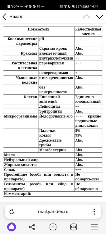 Cimasima3535 Опубликовано 9 марта, 2025 #1 Опубликовано 9 марта, 2025 Добрый день! У волнистого попугая в течении 2 недель жидковатый помет, иногда совсем жидкий, зеленоватого цвета, иногда нормальной континенции, но в водичке как будто. До этого была тошнота. Самец, 3 месяца. Давала 3 дня энтеросгель по 1 разу в день, потом 6 дней гамавит, 3 дня бифидумбактерин, сейчас даю расторопшу. Сидит на диете, даю замоченный корм Рио 1,5чл ложки и запаренный овес. Вес 35-36 грамм. Активность чуть ниже, чем обычно, иногда дрожит хвостик. Сдали сегодня микроскопию помета помогите пожалуйста расшифровать. Чем можно ему помочь?