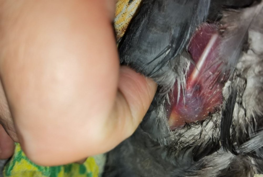 Берете птицу кульком. Это лапы, хвост и крылья вместе . Ватным диском с хлоргексидином размачиваете перья на грудке , грудка оголится . Держите столбиком перед собой. На спину нельзя опрокидывать !