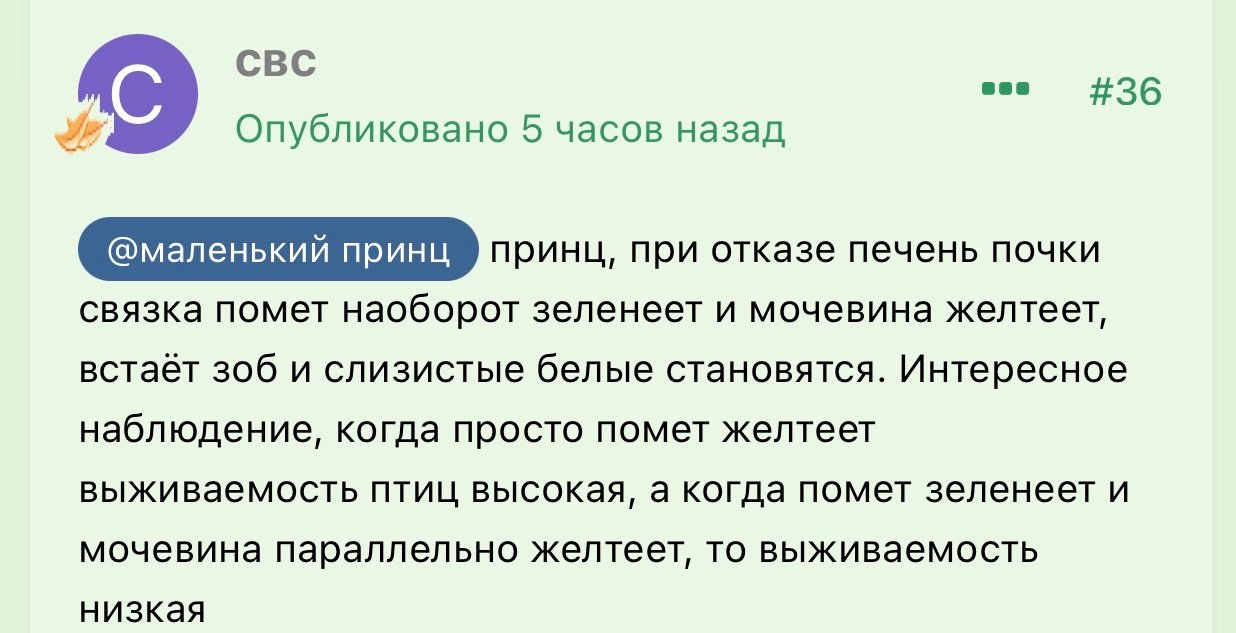 Я давно все хочу спросить. Меня вот какая мысль мучит. А можно ли вообще когда-то будет выдохнуть и расслабиться, что малыш здоров, ничего ему дома не угрожает, он живет здоровую счастливую жизнь. Читала как-то у одной девочки про голубей. Они у неё дома живут. Так вот у неё все так просто так легко. Никто не болеет, все здоровы, активны, упитаны и счастливы. А тут на форуме (как есть минутка стараюсь что-то почитать, чтоб хоть немного лучше понимать) в разных темах не все так ладно с голубями. Заболевают и те, кто уже не первый год дома живет. И все время всякие проблемы их сопровождают. У Брагиной вот читала про воронёнка Ключика, который внешне был здоров, активен, весел. И все хорошо, казалось бы. А у него там куча всего внутри происходит. В итоге Ключик умер. У такого специалиста. Невольно думаешь, а я то чего? Я ж вообще ничего не знаю не понимаю про них. Могу многое упустить… Сейчас буквально прочитала соседнюю тему про Гусика.