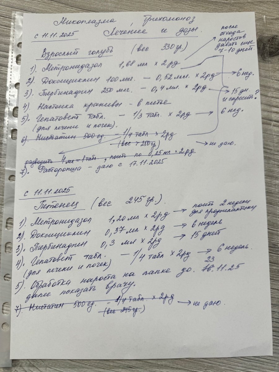 Юлия_03 Опубликовано 18 ноября Автор #89 Опубликовано 18 ноября В 17.11.2025 в 11:37, Budgiek сказал: Анализы, в данном случае я имею в виду трихомоноз, это нужно свежий помет смотреть на наличие простейших (обычная микроскопия) По анализам я поняла. Буду уточнять этот вопрос тогда чуть позже. Благодарю, все понятно объяснили. 21 час назад, Budgiek сказал: дозировки на Докси для каждой птицы, как давали, с какого числа, и как дозируете сейчас и когда изменили дозу. Прилагаю фото, там весь перечень того что даю сейчас, дата указана и вес птиц на начало лечения по этим дозам. Вес птиц на сегодня утро: - птенец 247гр - взрослый 280гр Дозировку с 11.11.25 не меняла никому. 21 час назад, Budgiek сказал: сколько был курс Сумамеда и точно дозировку (250/4, 0,3*2рд это из базовой 113мг/кг/сутки, это перебор, у нас максимумы 70 по Азитромицину сейчас) Сумамед давала: - взрослому голубю 4 недели по 0,3х2рд (был вес 303гр) - птенцу 14 дней по 0,1*2рд (был вес 140гр, далее увеличивала до 0,15*2рд. Через 21 день с момента как нашла его и начала лечение набрал вес до 275 гр. Перестала давать лекарства и через неделю, симптомы «гнойные глазки» вернулись. Начала снова давать обоим, но уже Азитромицин. Двоим одинаковую дозу по 0,3 *2 др. - неделя. Птенец стал терять в весе и отказываться от еду, собственно эту тему я завела по этой причине. Появилась слабость, апатичность, нарушение координации. Проблема была в шишке на ноге. После 2х блокад с цефтриаксоном пошел на поправку. Сейчас состояние птенца отличное, кушает, активен, вес набирает, шишка на ножке еще не отвалилась (мажем раствором Кастеллани 1рд) Взрослый голубь в весе теряет, но он и от еды отказывался, кушал раз в день. Вчера и сегодня кушает хорошо, появился аппетит. Воду с крапивой пьет, но мучает «забитый нос», после приема лекарств первый час дышит ртом и издает хрипы, похожие на то как человек храпит. Потом все успокаивается. Пытается толи высморкаться, толи откашляться. Видимы прям соплей нет, ну прям немного, во рту слизи практически нет, прозрачная какая то жидкость типа слюней. Наростов белых и желтых в клюве нет. С наружи то что проросло в районе челюсти (фото выше) мажу люголь. Состояние лучше, но непонятно что за «забитый нос».