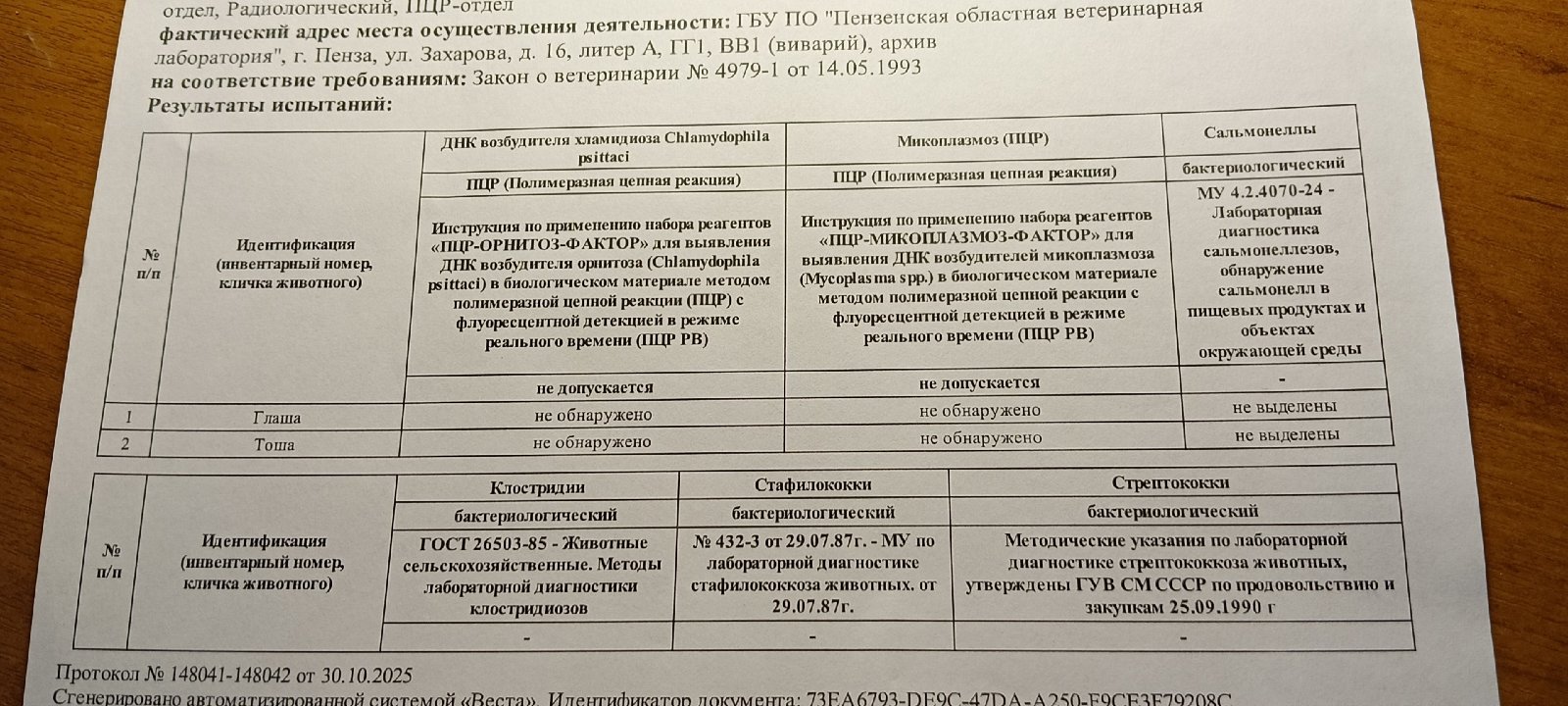 Neiran Опубликовано 16 часов назад #1 Опубликовано 16 часов назад Птицы - две кореллы. Старшему - год и 1 месяц. Младшей (ориентировочно, девочка) - 63 дня. Рацион. Зерновая смесь - делаю сам из разных кормов на основе разного проса, овса, подсолнечника, пшеницы + выращиваю сам на даче всякие вкусности, колоски чумизы, рожь и т.п. Пророщенка каждый день по 1 ~чайной ложке. Зелень каждый день с окна (просо-овес). Овощи, фрукты - каждый день (почти) свежие - морковь, яблоки, свекла (все свое), дополнительно из замороженного - перец болгарский, брокколи, горошек, как угощение - виноград, дыни, арбузы (уже закончились), сушеные - яблоки, калина, боярышник, черноплодка (все свое) - если не получилось дать свежего. Сепия, минеральные камни, копошилки (как покупные, так и из своих материалов, в зависимости от сезона), ветки плодовых кустарников и деревьев (крыжовник, жимолость, виноград, яблоня) + осина, береза. Старший ест все из вышеперечисленного (по крайней мере, пытается), кроме каши для младшей (не любит каши). Она же наоборот предпочитает кашу (гречка, просо, овес), в целом ест много овса, немного подсолнечника, грызет всеразличные колоски (просо, чумиза, рожь особенно) и веточки. Не любит просо и ест его только с моих рук. Световой день - у старшего 13-14 часов, у младшей 12-13. Обоим добавляю в поилку по 3 капли Beaphar Vinka. Пока что капаю неделю (начал после сдачи анализов), планирую давать еще неделю обоим, потом перерыв на месяц. Поведение птиц - отличное, обе очень активны, поют (старший), чирикают, пищат (младшая просит еду и внимание), много летают по разным комнатам (карантин). Из проблем - у младшей на 2 день после переезда покраснел глаз, окончательно прошел спустя дней 5. Сейчас проблем нет. Помет хороший у обоих. У младшей более жидкий, т.к. ест в основном кашу (иначе мы орем и просим еду). Если надо, могу выслать фото, каких-либо изменений не было, у старшего все нормально с ним очень долго, у младшей в начале при переезде был не очень, сейчас хорошо стабилизировался. Вес - у младшей 78 грамм (после приезда было 72), у старшего около 82 грамм (он примерно всегда такой, т.к. активный почти все время) Взял новую кореллу в пару для своего самца (или хотя бы друга) у частника. Птицу посадил на карантин (уже 2 недели на нем) и сдал анализы на различные болезни. Результат - у обоих выявлена кишечная палочка. Пошел искать информацию, нашел, что больше 10^6 - уже опасно и лечить нужно антибиотиками. Если меньше, то можно препараты на основе сенной палочки (ветоспорин). Решил позвонить в лабораторию (единственной ветлаборатории в городе) и уточнить. Ответ был следующий - у нас в лаборатории нет инструментов для определения количества кишечной палочки. Мы выращиваем ее, после подселяем ее белым мышам. Если они гибнут - она патологическая, живут - наоборот, все как бы нормально. В нашем случае с обоих проб мыши погибли, т.е. кишечная палочка патологична. Это все. Подскажите, как поступить в данной ситуации. Есть ли смысл бить тревогу? Или просто пропить профилактически сенную палочку и пересдать анализ через пару недель? Держать ли дольше птиц на карантине? Может, кто сталкивался или имел похожую дилемму. P.S. И да, в единственной ветлаборатории в городе нельзя сдать копрограмму помета на все (типа ph, слизь, наличие чего-либо в помете). В понедельник попробую сдать в человеческую лабораторию.