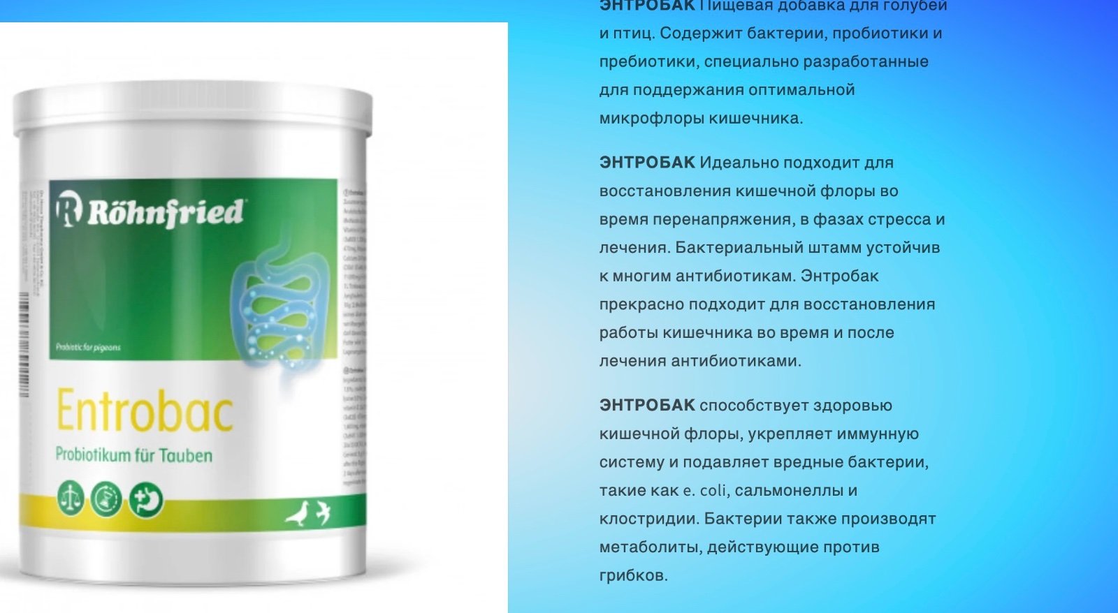AlisaGordon Опубликовано 3 декабря, 2025 Автор #27 Опубликовано 3 декабря, 2025 22 минуты назад, маленький принц сказал: а состав пробиотика какой? какие в нём живые бактерии содержатся? Энтробак идеально подходит для очищения кишечника во время или после физических упражнений, диетических изменений, стрессовых фаз и процедур. Бактериальный штамм устойчив ко многим антибиотикам, поэтому энтробак идеально подходит для структуры кишечника во время и после лечения антибиотиками. Энтробак стимулирует положительную кишечную флору, укрепляет иммунную систему и ингибирует вредные бактерии, такие как кишечная палочка, сальмонелла и клостридии. Кроме того, бактерии производят метаболиты, действующие против грибков. Состав: Ингредиенты: мальтодекстрин, декстроза, дрожжи 5,0%. анализ: сырой протеин 1,8%, сырой жир 0,2%, сырая клетчатка 5,0%, сырая зола 3,0%, натрий 0,0%, метионин 0,12%, лизин 0,0%. добавки на кг: Витамины: витамин A (3a672b) 225 000 МЕ, витамин E (3a700) 600 мг, витамин K3 (3a710) 40 мг, биотин (3a880) 1500 мкг, витамин B1 (3a820) 87 мг/пид4сол B2/рибофлавин-5-фосфатный эфир 1800 мг, витамин B12/цианокобаламин 2500 мкг, ниацинамид (3a315) 1000 мг, пантотенат D-кальция (3a801) 1000 мг. Стабилизаторы кишечной флоры: Bacillus subtilis DSM15544 (4b1820) 20×1010 КОЕ. Антиоксидант: аскорбат натрия (1b301) 11 000 мг. Рекомендации по применению: общий: 5 г (=1 мерная ложка) на 1 кг корма или 1 л питьевой воды. гоночный сезон: 2 дня после полета. линька и размножение: 2 раза в неделю. молодежь: 2 дня до и 2 дня после каждого предполета. после лечения: 10 г (=2 мерные ложки) на 1 кг корма. 1