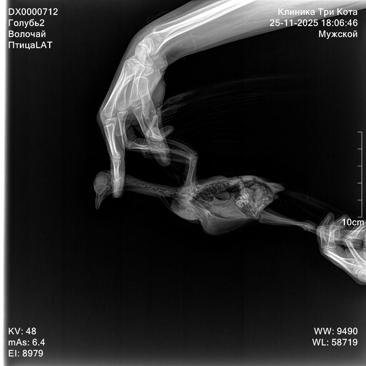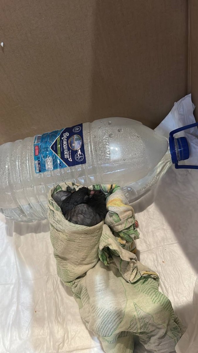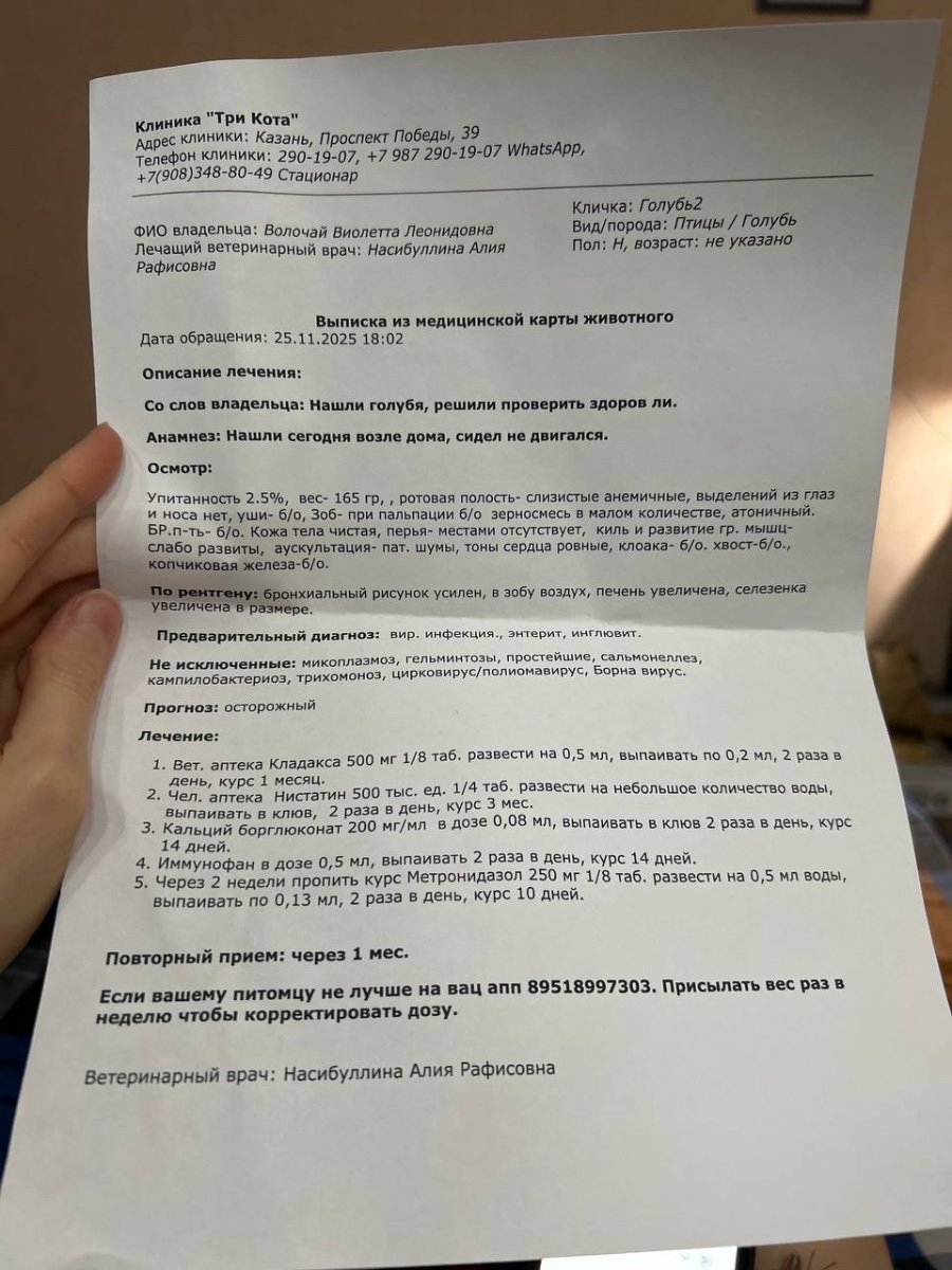 прошло 1,5 года после лечения предыдущего голубя, не думала что мне когда то еще раз выпадет шанс полечить другого. Но вот сегодня, выйдя во двор, был найден птенец голубя, который сидел неподвижно на земле. Когда я тронула его бутылкой, он запищал, стало понятно что это птенец. Сразу завернула его в тряпку и принесла домой, отогревать. Параллельно записалась к ветеринару. После отогревания ему стало немного лучше- чистился, немного ходил. Ветеринары провели осмотр, анализа калла и сделали рентген. Результаты обследования прикрепила. Сегодня врачи также сделали раствор глюкозы и кладаксу, остальное лечение начнётся завтра, лекарства уже заказаны. Надеюсь получится спасти малыша🥹