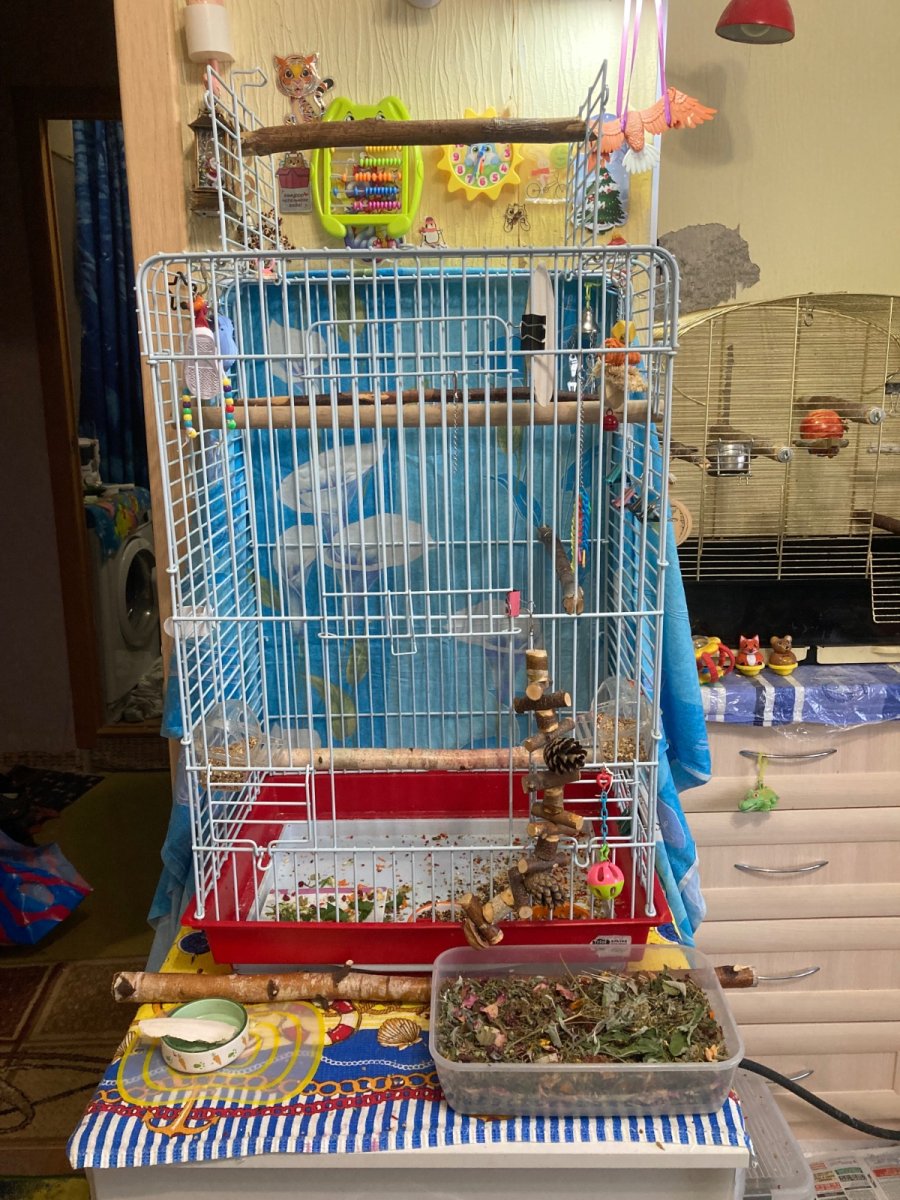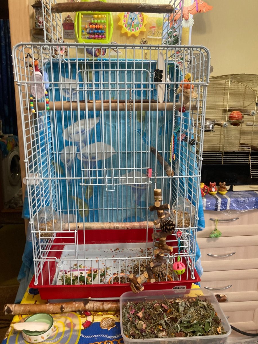 На дно клетки поставить сетчатый поддон который был в комплекте с клеткой.