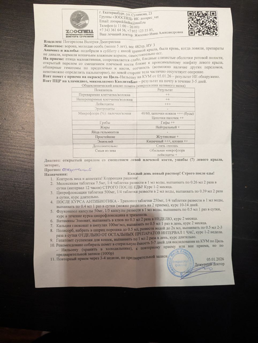 Эля_Т Опубликовано Вторник в 13:06 #1 Опубликовано Вторник в 13:06 (изменено) Здравствуйте, нахожусь в Екатеринбурге. Но могу перевезти птицу в другой город, если найдется для нее человек. 3 января я нашла раненую ворону, оказалось , ей или ему всего 2 года. У птицы было сломано крыло и я забрала ее с улицы. Центры реабилитации Екатеринбурга не были готовы принять такого пациента, а центр Солнечная птица в Нижнем Тагиле выразил готовность принять весной, через пару месяцев на ПМЖ. Мы обратились в клинику ЗООСПЕЦ и сдали часть анализов, но требуется рентген и возможно операция, это в планах на ближайшее время. Но главное — уход, который я или кто-то из тех кого я знаю, не может оказать достаточно хорошо, в силу того, что мы не имеем опыта реабилитации птиц. Сейчас у вороны перевязано крыло, она сидит на закрытом балконе в коробке, так как в квартире проживают другие животные. Питается мясом, фруктами, орехами. Попытка дать прописанные препараты не увенчалась успехом, птица боевая и бодро клацает здоровым клювом. Может быть кто-то захочет взять к себе временно (до весны) или постоянно? Мы можем договориться о материальной помощи, не то что бы это для меня легко, но я очень хочу помочь и одновременно осознаю, что не обладаю достаточными навыками и условиями. Изменено Вторник в 13:26 пользователем Эля_Т