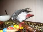 Бамбра Опубликовано 17 января, 2008 Автор #24 Опубликовано 17 января, 2008 "подробный дневной рацион Вашей птицы (включая информацию о витаминах, минеральных добавках и лакомствах, которые Вы ей даёте)":1) Зерновая смесь Престиж Премиум для крупных попугаев (семечки не выбираю), смешанная с кормом для волнистых тоже Престиж. Съедает сначала семечки, потом - просо, потом - овес. Плохо идут белые семечки среднего размера. Гранулы не трогает. Перец, шиповник выкидывает.Прор ащиваю ту же смесь с добавлением чечевицы. Предлагаю, как минимум, через день. Почти не ест. Выбирает пророщенные семечки. Пророщенное зерно лучше ест, если оно сухое. 2) Овощи: морковка - предпочитает. Капуста - грызет с нами за компанию, больше раскидывает. Перец сладкий - больше раскидывает. Перец не сладкий - игнорирует. Листья (салат, пекинская капуста) - играет, рвет (даю вместо бумаги); может, что-то попадает. Сельдерей - с удовольствием.Фасоль вареную пробовал. Кашу из бобовых пока не делала. 3) Фрукты: сладкие яблоки, зеленый сладкий виноград (пару раз в неделю штук по 6), гранат (раза 4 в неделю по 1/8. Что-нибудь даю каждый день. 4) Каши не ест категорически. Пока. Добавляю сверху семечек (из зерновой смеси), зернышки граната. 5) Кефир раза 2 в неделю. 6) Творог с медом, наверное, 1 раз в неделю. 7) С удовольствием пьет клюквенный морс (с медом), компоты. (Примерно по 1-2 столовой ложки). 8) Орехи не ест: грецкие, кедровые, миндаль. Ест только иногда арахис. Но больше нравится раздербанивать скорлупку, ядрышко может бросить. Иногда ядра оставляет в корме. 9) Лакомства: семечки (штук 10-15 в день), или виноградины (до 6 в день). Понимаю, что семечек многовато. 10) Витамины Vita-Sol по 6 капель в кормушку. Один курс - в сентябре (2 недели). Второй курс - в декабре. С 10 января - опять начала капать.По-моему, в целом, все. "информацию об условиях содержания, режиме купания и световом режиме птицы;"Комната большая (24м), светлая (окны - на юго-восток). Под окнами - церковь, так что два раза в день - колокольный звон, на который не реагирует. В комнате все время кто-то находится. Клетка теперь Cирена. Стал активнее передвигаться по квартире. Выходит из комнаты. Чаще спускается на пол (почти каждый день). Стал больше летать. Даже сидя на столе, перепархивает с места на место (иногда).Из пульверизатора опрыскиваю каждый вечер ("душ", и семечка). Примерно два раза в неделю Гоша хочет купаться, расправляет крылья, ерошится. Тогда ставлю миску с водой, в которой он "мочит крылья", опрыскиваю "до промокания". Не сушу. Фотографировала как раз после купания.Отбой в 21.30. Накрываю клетку покрывалом. Снимаю покрывало около 8.00. "информацию о психологических сторонах Ваших с птицей взаимоотношений (степень привязанности птицы к владельцу, режим общения, умение (неумение) птицы занять себя и т.п.)"Из новостей - стал больше играть с подвесными игрушками (видимо, привык к ним). Сидя на плече, сначала сопит, а потом бормочет. Из услышанного: "Гошик".