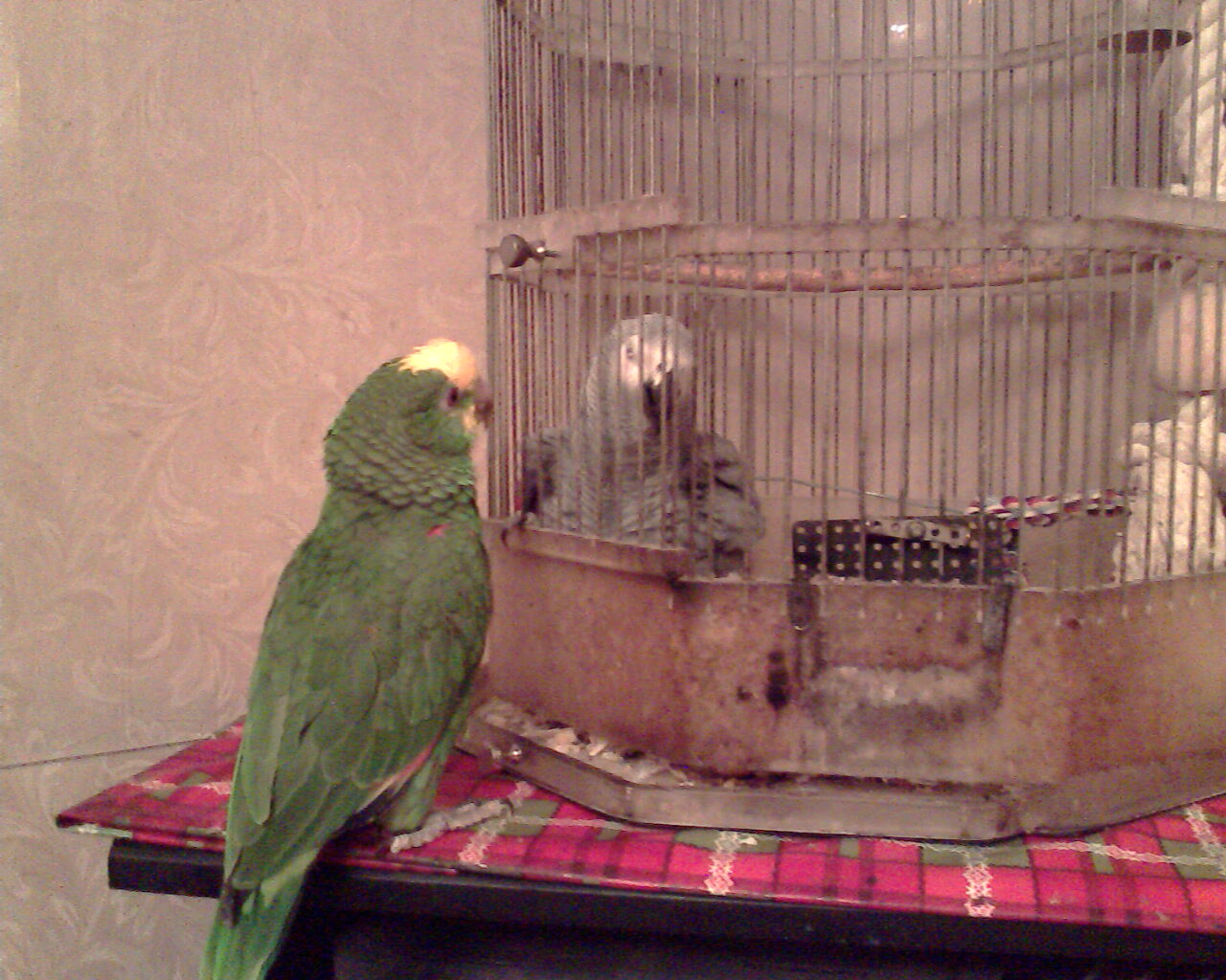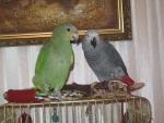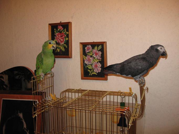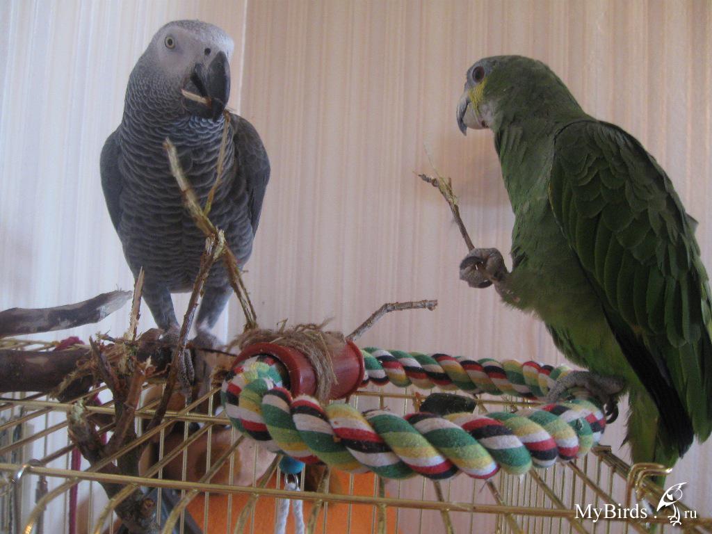 НаталиК Опубликовано 27 апреля, 2011 #13 Опубликовано 27 апреля, 2011 Первым появился венесуэльский амазон, молодой дикарик. Выкормыша-жако взяли через 7 месяцев. В период карантина в разных комнатах амазончик проявлял всяческий интерес, сразу понял, что есть другая птица и рвался посмотреть. Знакомили постепенно. Сейчас живут в одной комнате, спят, едят в разных клетках. Разрешают друг к другу ходить в гости, часто меняются клетками и кормушками. Играют вместе, бандитствуют. Случаются и разборки, без членовредительства. Жако ведет себя, как хозяин; считает себя самым любимым, ему все можно, отнимает у амазона игрушки и вкусности, когда быстро съедает свою порцию. Многому научились друг у друга. Жакоша хорошо общается с амазоном на его языке, по первости они друг друга явно не понимали, сейчас договариваются о любой пакости, обсудят и нашкодят дружно. Во всяком случае они не скучают, когда мы заняты, но жакоша при первой же возможности стремится к людям.