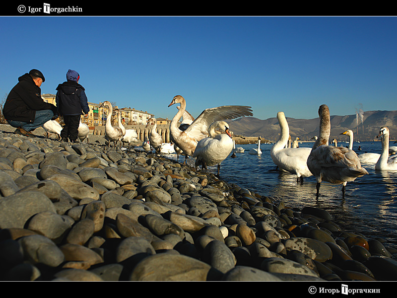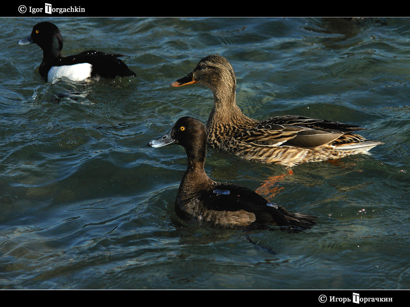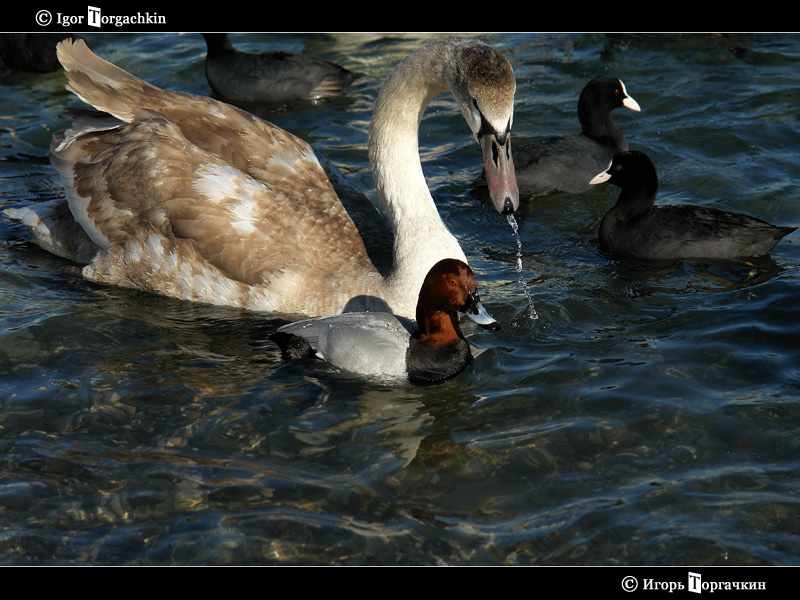 Torgachkin Опубликовано 1 февраля, 2008 #1 Опубликовано 1 февраля, 2008 Битва за хлеб!В зимнее время, когда замерзают Приазовские лиманы, лебеди, нырки, утки, крачки и чайки прилетают на Черноморское побережье. В окрестностях Новороссийска возле лебединых стай кормятся утки, лысухи, нырки, подбирая брошенный птицам добрыми людьми хлеб, который нещадно вырывают буквально из клюва вечно голодные крачки и чайки. На фото крачка преследует уплывающею с куском хлеба в клюве самку Красноносого нырка (Netta rufina). Хохлатая чернеть и Кряква.Хохлатая чернеть (Aythya fuligula), селезень и самка и примкнувшая к ним Кряква, самка. Хохлатая чернеть (Aythya fuligula), заметно мельче утки. Оперение черное, бока и брюшко белые. На голове свисающий назад хохол. Клюв и лапы серые, глаза желтые. Самка бурая с беловатым брюшком, у основания ее клюва белые перышки, хохол меньше. Перелетная птица. Полет стремительный, шумный, с воды поднимается тяжело. Хорошо ныряет. Голос селезня тихий звук, у самки – довольно резкое карканье. При определении следует обращать внимание на хорошо заметный хохол. В зимнее время, когда замерзают Приазовские лиманы, нырки прилетают на Черноморское побережье. В окрестностях Новороссийска Хохлатая чернеть встречается возле лебединых стай, подбирая вмести с лысухами и другими утками брошенный птицам добрыми людьми хлеб. Кряква, лысуха и нырок.Кряква самка в окружении Лысухи и селезня Красноголового нырка.Цемесская (Новороссийская) бухта. Черное море. Окрестности Новороссийска. Лебедь, нырок и лысухи.Молодой Лебедь-шипун (Cygnus olor) и селезень Красноголового нырка в окружении лысух. Кряква (Anas platyrhynchos), на фото самка. У самца голова и шея черно-зеленые, зоб и грудь каштановые, спина и брюшная сторона тела серые с тонкими поперечными пестринами. Самка сверху бурая с ржавыми пестринами, снизу буровато-серая с неясными продольными пестринами. Клюв розоватый. На крыле у самца и самки сине-фиолетовое зеркальце. Голос селезня – глухое кваканье, самки – как у домашней утки. Перелетная птица. Населяет пресные водоемы Кубани. В зимнее время, когда замерзают Приазовские лиманы, утки прилетают на Черноморское побережье. В окрестностях Новороссийска кряква встречается возле лебединых стай, подбирая вмести с лысухами и нырками брошенный птицам добрыми людьми хлеб. Лебедь-шипун (Cygnus olor) - молодая особь. Перелетная птица. Клюв красный, у основания черный нарост. Голос – глуховатый и хрипловатый крик. При определении надо обращать внимание на характерную позу шипуна с изогнутой шеей и приподнятыми крыльями, которую он принимает на воде. Дикие Лебеди в Новороссийске!Лебеди, оставшиеся в Новороссийске на зимовку. Я думаю, что Вам будет интересно узнать, почему дикие лебеди и утки всегда прилетают на зимовку именно в Новороссийск! Да по той простой причине, что их здесь любят, кормят и берегут! В Новороссийске есть прекрасная традиция водить детей на прогулку на море кормить лебедей, диких уток и чаек; и птицы с благодарностью отвечают доверием. Белые лебеди в Черном море - это очень красивое зрелище! Цемесская (Новороссийская) бухта. Черное море. Окрестности Новороссийска. Остальные фото про птиц Кубани здесь: Фото-архив © Игорь Торгачкин http://torgachkin.flamber.ru/photos/ http://fotki.yandex.ru/users/torgachkin/