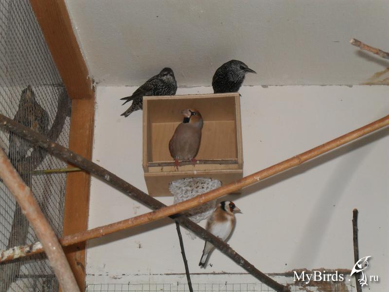 sirinus Опубликовано 30 декабря, 2012 #36 Опубликовано 30 декабря, 2012 sirinus, Поле просмотра фотографий появились вопросы. Вообще, стены птичника из чего сделаны - деревянные, каменные? Есть какое-либо утепление? Если раньше в птичнике стояли клетки, то, видимо, настелен пол? А кровля из какого материала? Как устроено освещение в птичнике? Естественное или есть искусственное? Уличный вольер интересно было бы посмотреть. Как он стыкуется с вольерами в птичнике? По фотографиям кажется, что в птичнике как минимум два вольера. У каждого свой выход в уличный? Делали какую-нибудь защиту от грызунов и хищников в уличном вольере? На фото видны гнездовой домик (где скворцы и дубонос) и гнездо (рядом с зарянкой). Размножаются? Близкое соседство других птиц не мешает? Вольеру строил по принципу каркаснощитового домика. Размеры 6 на 3 м. высота 2,62 Каркас из деревянного бруса 150*50. Длина выбрана 6 м. потому, что длиннее у нас не продают. Внутри обшито мебельным ДСП 16 мм., а снаружи обрезная доска 25 мм. Пустота засыпана опилками. Потолок из ДСП, утеплен опилками 200 мм. Крыша двускатная рубероид + шифер. Внутренние размеры 3,5 м. на 2,75, такие размеры ДСП. Внутри все покрашено известкой, каждые полгода. Освещение две лампы накаливания по150 ват. Пол частично забетонирован. Оставлены участки земли для посадки елок, которые периодически меняю. В птичнике две вольеры (размеры 2,5 на 1.5 м. и 2,5 на1,25 м.) и два садка (размеры 1*1*1,3 м. д*ш*в) С уличным вольером соединяется только один, а во втором открываются окно. Хищные птицы для меня проблема номер один. Приходится каждый год отлавливать по два, три. Для защиты от хищных птиц пришлось построить неказистую конструкцию. Она и защита, и ловушка и мой позор. Кстати в начале недели сын очередного хулигана поймал. Размножать пробовал, но не получается. В птичнике в вольере ставил всевозможные гнезд и отдельно по парам, но ни каких результатов. В уличной вольере ни чего не делал, а они сами в толпе загнездилиось. Но на 4 или 5 день после вылупления птенцы погибали. В этом году так загнездились зеленушки два раза и зяблики. А проблемы есть, сразу о всех не рассказать.