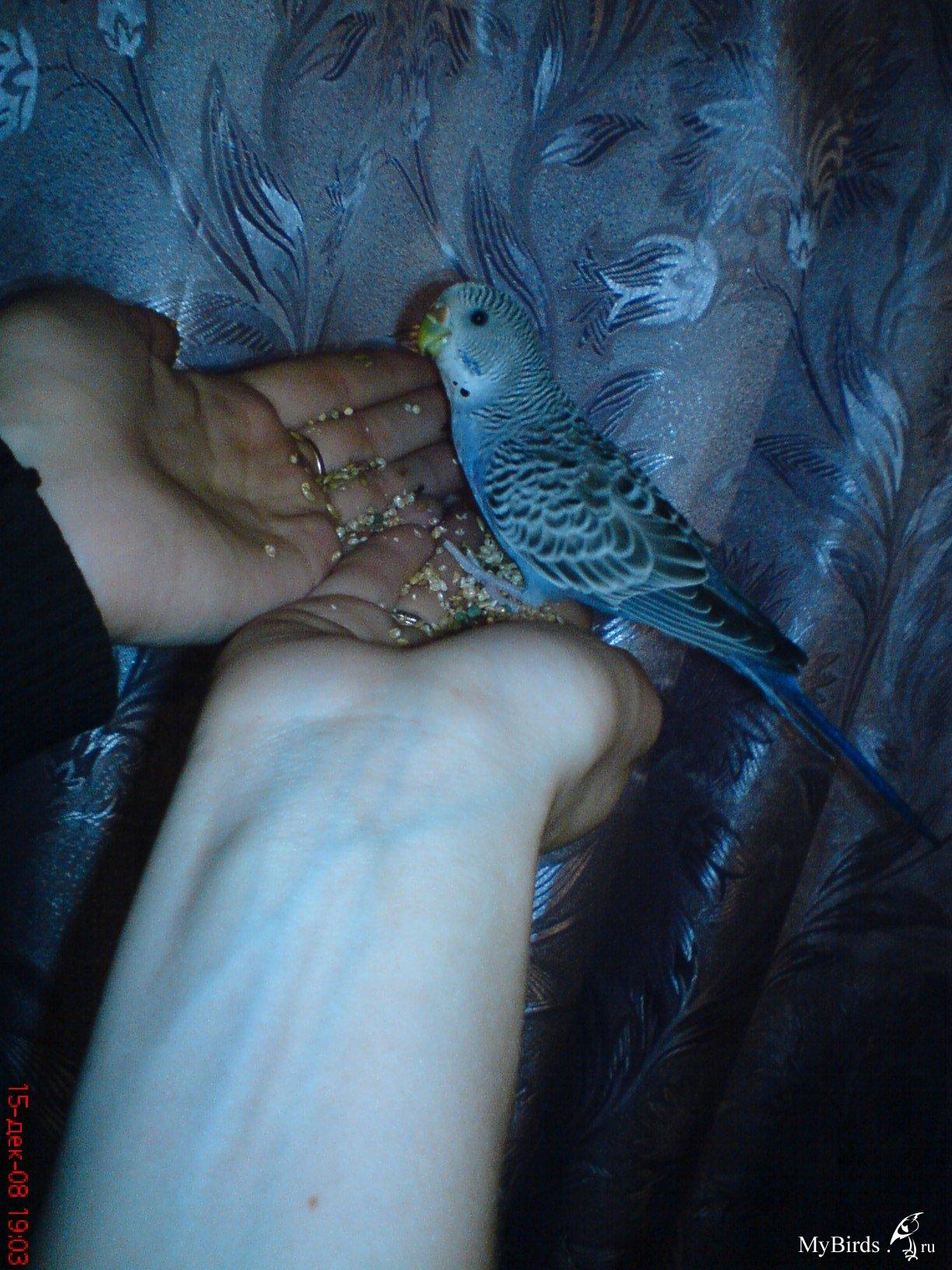 Кристя Опубликовано 18 ноября, 2008 Автор #316 Опубликовано 18 ноября, 2008 Привет! У нас все пока так же. Рита играет целенаправленно- я держу руку с зерном, а она сначала пробежит под ней, потом прыгает на руку, и сразу на жердочку. и так же назад. Подбегает ко мне и тянется к губам- может думает что я буду её кормить?Вот я должна уехать на три дня и теперь просто не знаю как быть. если оставить её в той же комнате, ей будет совсем скучно, меня не будет и заниматься будет некому. покормят разве что. а если перенести к Шуриковым- то Шурик не даст покоя- он прилипает к клетке, и не отходит от Риты. скучно конечно ей не будет, но контакт с Шуриком пока может повредить. тем более и Рита у нас с базара приехала...так что просто разрываюсь и не знаю как быть , и что выбрать. И опять фото в синих тонах))), надо менять фотоаппарат. Караур сказал что Рита возможно получешка. очень уж бусики наросли большие. Интересно что будет у нас после первой линьки?