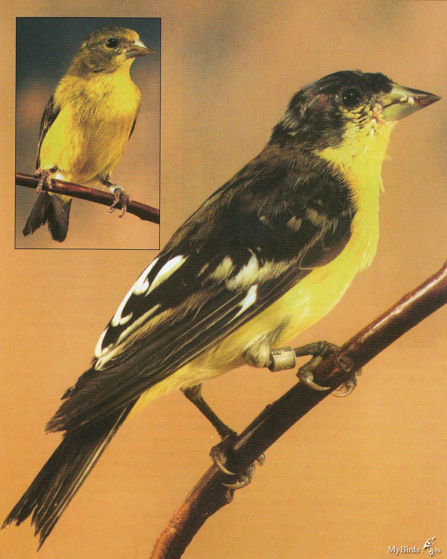 GA. Опубликовано 27 июля, 2008 Автор #5 Опубликовано 27 июля, 2008 (изменено) Чиж золотой (Spinus tristis) Linne, 1758Обитает в США, южной части Канады и на севере Мексики. Имеет четыре подвида, разделенных георафически и имеющих незначительные отличия в окраске оперения. Длина тела - 13 см.Раннее был популярной клеточной птицей, но теперь очень редкий и желанный для многих любителей. По поведению и образу жизни, очень похож на нашего чижика. Из-за возникающих недорозумений с латинскими и другими национальными названиями, очень часто именнуется щеглом. Изменено 27 июля, 2008 пользователем GA.finch
