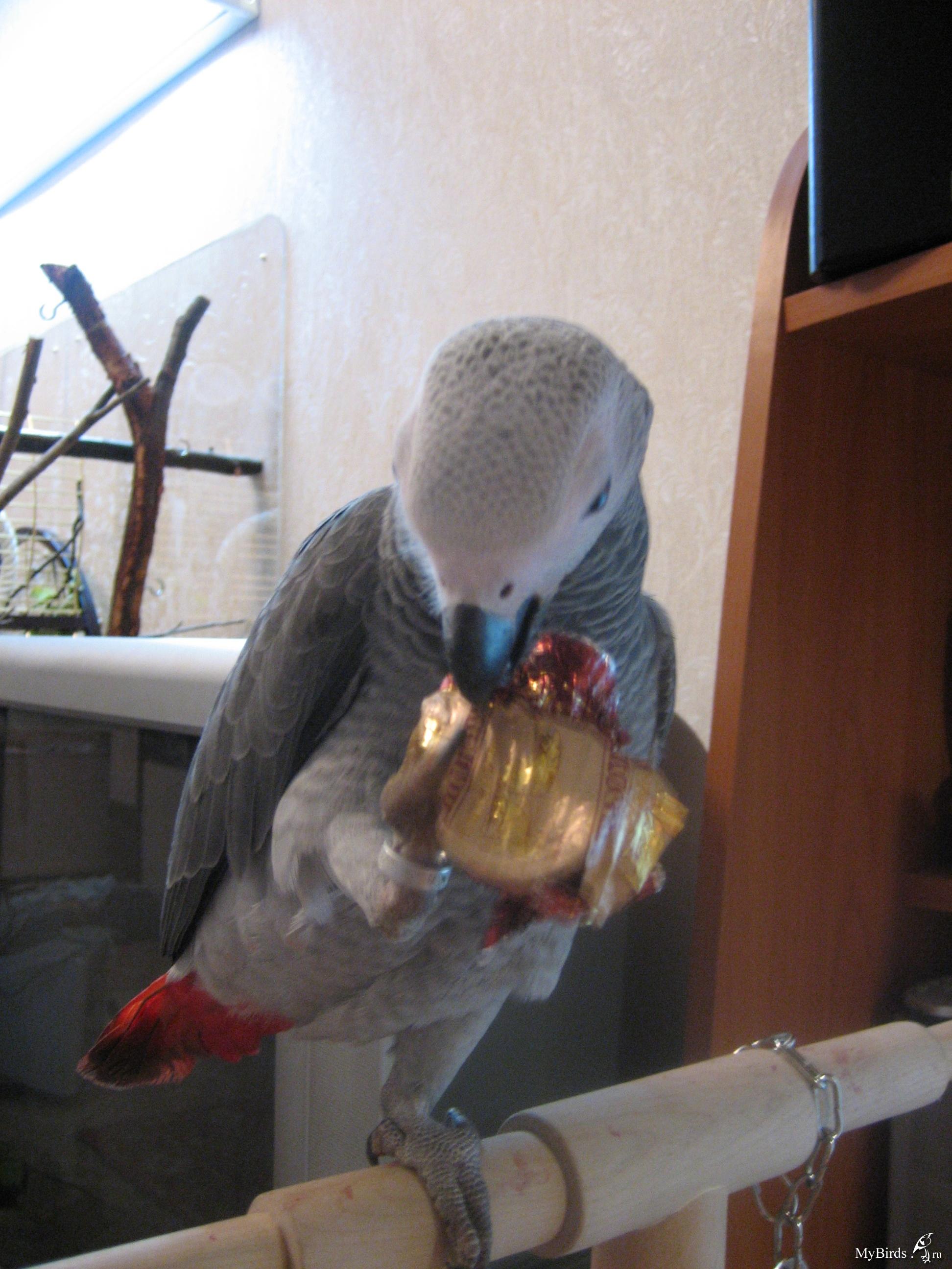 Jersy Опубликовано 30 сентября, 2008 #360 Опубликовано 30 сентября, 2008 У нас произошел переломный момент. Резко, без видимых причин. Просто пару дней назад Рикки слетел ко мне, заинтересованный фотоаппаратом, на следующий день прилетел, исследовать телефон. А еще на следующий, пришивание пуговицы вызвало у него интерес и он снова прилетел, с приземлением на голову . И в это же время стал идти на руку. И ко мне, и к подружке. Конечно, не всегда, но очень часто. Я всегда сопровождаю его перешагивание командой «вперед». Ползает по руке, сидит на коленках. Теперь надо срочно думать, чем его занимать. Какие игры можно придумать, т.к. птичка уже готова общаться и тянется «в общество». И у нас ушла проблема захождения в клетку. Он такой обжорка, что более часа находиться вдали от кормушки просто не может . А если я «закладываю» туда вечерние «фрукты», все – гулянка окончена! И слово «фрукты» Рикки отлично понимает. Так что и гуляем мы теперь каждый день, хоть и понемногу. Хочется сказать про интерес выкормышей к человеку. Когда они почувствуют интерес к определенному человеку, то может быть и так что не будет ему предела.. Бывает жако становится просто липучкой и не всегда от этого кайфуешь!!)) Например моя Агуша, это просто затычка в каждой бочке: я чищу зубы, она выхватывает щетку, я мою полы, она висит на швабре, я крашу глаза, она пытается украсть тушь, я разговариваю по телефону, она слушает внимательно и начинает трещать, после чего не слышно кто и что говорит в трубке, я складываю посуду в шкаф, она сидит на дверце шкафа и тщательно контролирует как это так у меня получается все складывать...)))Короче с такой позицией питомца не всегда удобно получается делать некоторые вещи)))