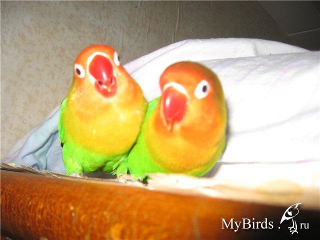 Katrint Опубликовано 28 сентября, 2008 #19 Опубликовано 28 сентября, 2008 (изменено) НАИЛЯ, Амайзе, ElenaM, Спасибо за ответы, друзья. Да, пополнить в дальнейшем пару будет намного приятней и мне и самой птичке не так скучно. Карантин-вещь правильная. соблюдаю 2 а то и 2,5 недели. Птичка говорите постарше чем 2 месяца? как же определяете, все же не пойму? %) По поводу окраса очень непонятный окрас.. То ли гибрид, то ли Фишер но молоденький и не перелинявший.. Все равно симпатюличка, к тому же присутствия человека не очень боится, а к рукам приручать придется в любом случае. Чирикает мило и если не спит, то озорничает в клетке . Веселый птенчик Он пусть и годовалый, но выглядит как птенец на фоне Ожерелика Tosha, я тоже считаю, что возраст вашей птички старше 2 месяцев, так как у маленьких птенчиков на клюве есть черные пятнышки, ну и оперение еще неяркое, окрас только формируется. Окрас у вашей птички стандартный, единственное, головка, кажется, чуть темнее. Может, действительно, смесь фишера с масковым, хотя, не факт. Прикрепляю к сообщению 3 фотки, на первой - Гарри и Гермионе 4 месяца, на второй и третьей - больше года. Фишеры - очень подвижные птички и очень-очень любопытные. С вашем попугайчиком вам точно скучно не будет. Изменено 28 сентября, 2008 пользователем Katrint