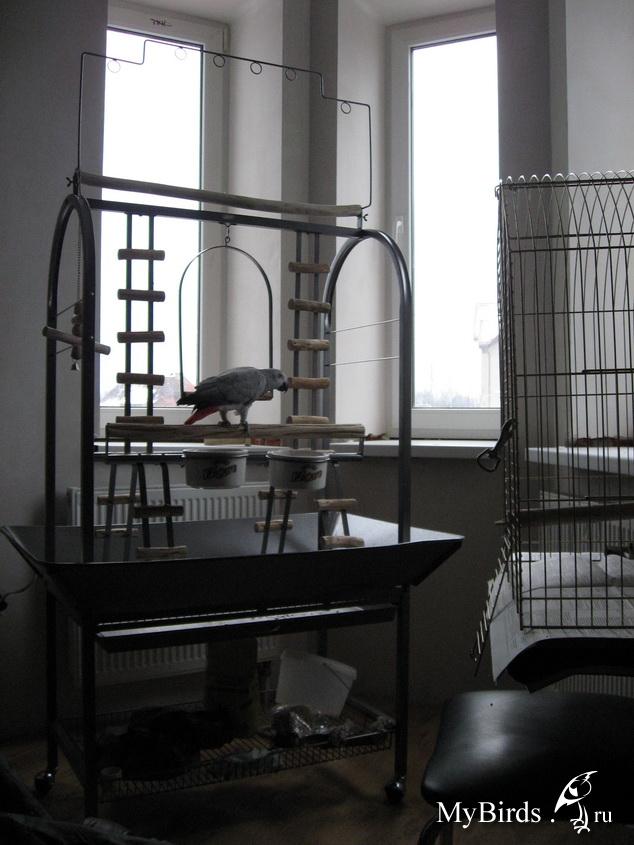 Alvida Опубликовано 27 ноября, 2008 Автор #27 Опубликовано 27 ноября, 2008 (изменено) Alvida, искренне сочувствую.. Папа не виноват имхо..З.Ы. А фотки Гриши будут? Ага Сейчас чудо расчудесное налетавшись (сегодня уже меньше чем вчера) дрыхнет на игровой площадке.Попозжа пересажу его в клетку, чтобы утром не спикировал куда-нибудь. Вот такая площадка у нас появилась. Фото вчерашнее. Рядом клетка (паддон кормушка и игрушка в чистке). Сейчас на площадке +1 игрушка. И довешу канат (сегодня по магазинам не нашла), так как не может птиц спустицца с верхней жерди на нижнюю к кормушкам. Пролет лесницы велик.Сегодня после полета посадила его на верхнюю. Попозже положила в кормушку Гранат.Бедный и так пробовал спуститься и так..Потом полетел, правильно расчитав, что быть может пересадят к кормушкам поближе. Хитрюга, еще и ругался, что мол, видите не достаю я, чего стоите смотрите. Вообще он у меня хорошо переносит новые места. Довольно быстро привыкает к людям.Только вот мущщин почему-то не любит. Аж кидается.Такой распушается отВАЖНЫЙ становится, разбегается иии как кинется на паддон клювом! Может потому что брат дразнил.. Папа ему даже корм в клетку насыпать боится. Делает это длинной столовой ложкой (но такое бывает крайне редко). Изменено 27 ноября, 2008 пользователем Alvida