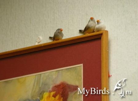 Monhrisa Опубликовано 31 декабря, 2008 Автор #6 Опубликовано 31 декабря, 2008 А вот прололжение истории. Вот наши пташки приехали в мастерскую. Пока поместили их в крошечную клеточку. Назвали их так:серую-Грета, белую-Альба ,слепушку-Дея (слушали тогда Гюго МР3) Ну конечно хищница №1 кошка Тоська не могла оторвать от них глаз. Выглядело это вот так: Как ни гнали, щёлочку нашла! А вот фото наших красавицНадо сказать, что тогда мы держали ещё пару волнистиков,но как не береглись,хищник №2 кошка Мышка, вскоре во время прогулки смертельно поранила самку волнистика и тогда мы решили НИКОГДА не будем выпускать птичек! (А то у нас есть ещё хищник № 3 ротвейлер Рич, и он тоже не против поохотиться) А Чикусеньку отдали в очень хор.руки. Да уж было дело... а сначала мы наших амадинок пускали запросто полетать по мастерской, просто снимали крышу клеточки и вперёд!Сначала вылетали Гретка с Альбой,а потом на их весёлый мяк и Деечка.Часто она садилась на цветок и перемякивалась пока не находила своих и тогда летела.вот так: Возвращались они домой как это ни странно сами за едой,кроме Дейки,ну её и до сих пор не проблема поймать.Слепушка наша и фотика не боится.Потому,что не видит.