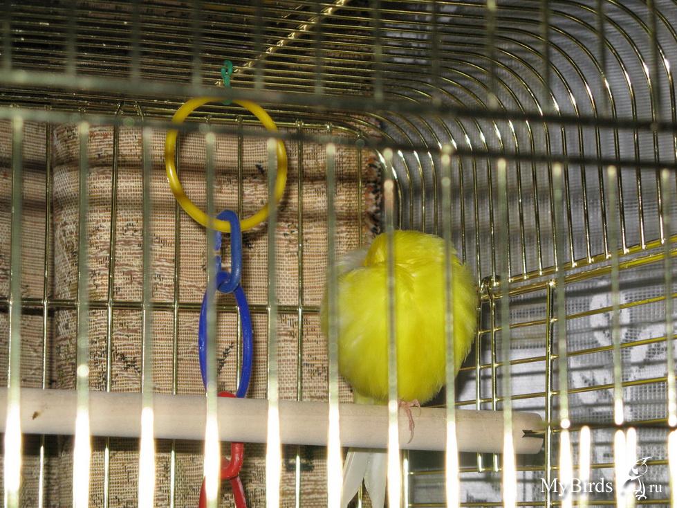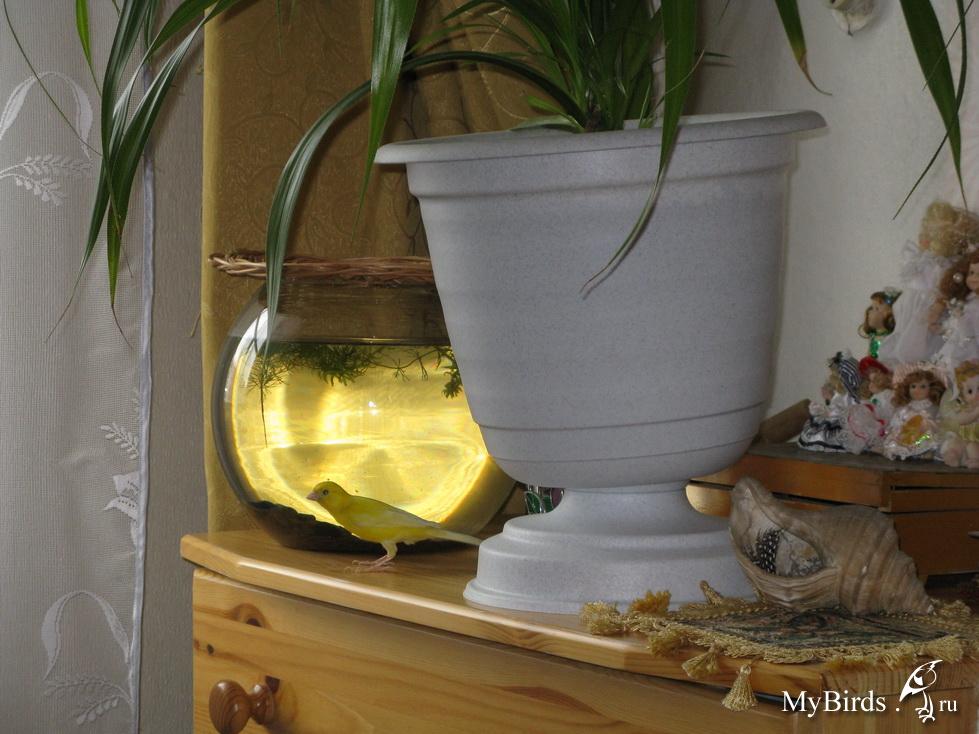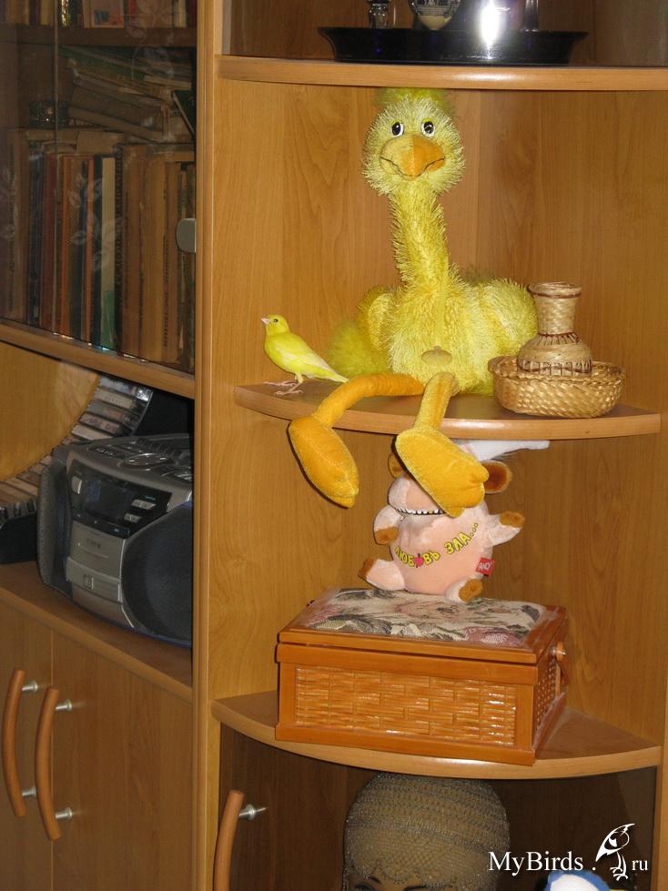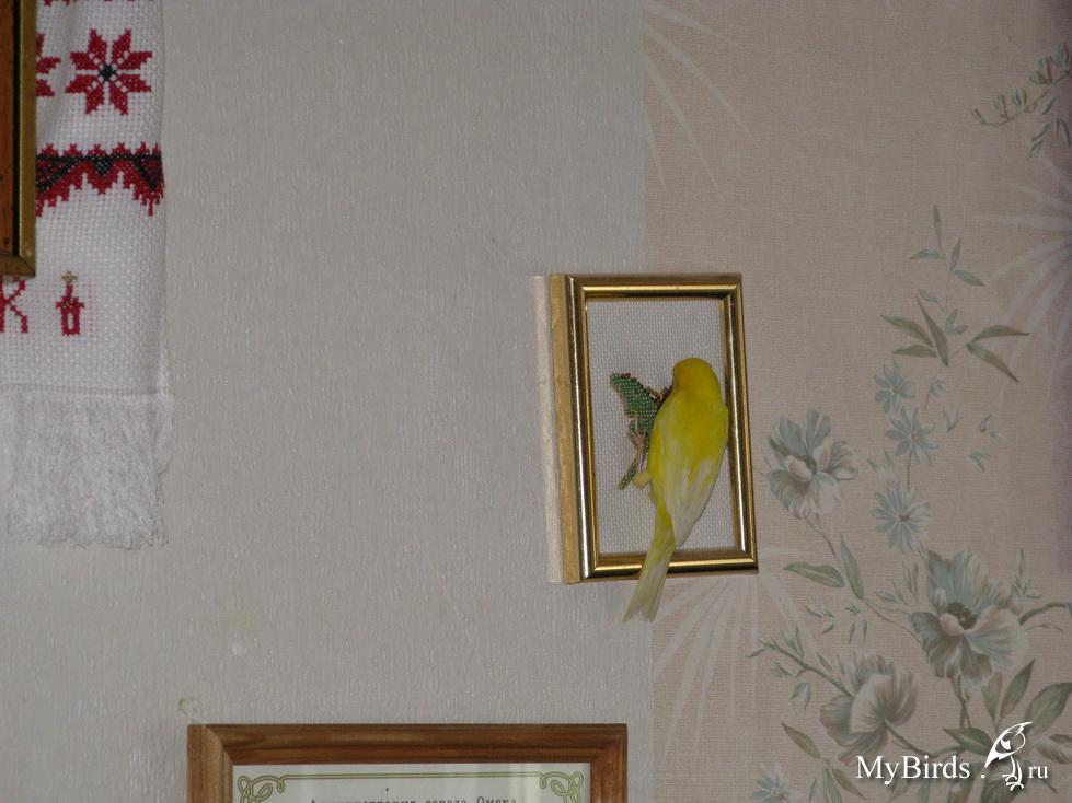 Juliett Опубликовано 9 апреля, 2009 #20 Опубликовано 9 апреля, 2009 Вот что бывает с непослушными канарейками! Они попадают в старые рваные сачки.Это Мультик отправился на прогулку. Очень быстро захотел домой, но никак не мог найти дверцу. А долго оставлять клетку открытой я не могла, т.к. там есть и другие обитатели. Пришлось ловить. Вообще его похождения сняты на видео, в том числе как он поет дуэтом со своим отцом.А вот в какой позе любит сидеть Шляп. Частенько его застаю в такой "угловой" позиции.