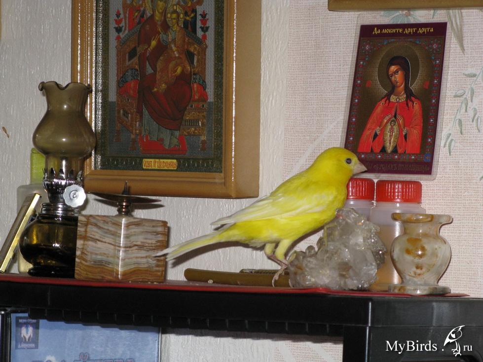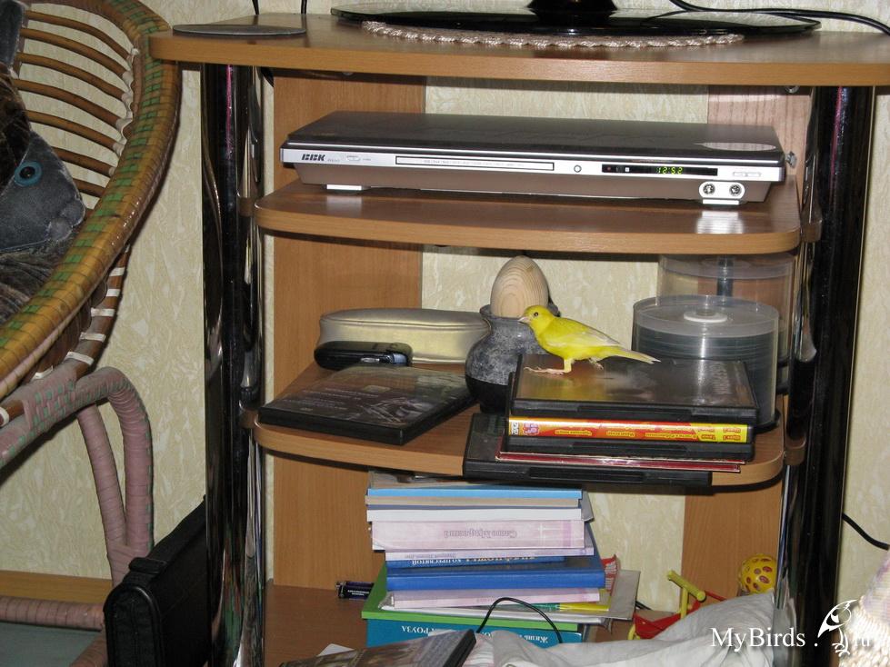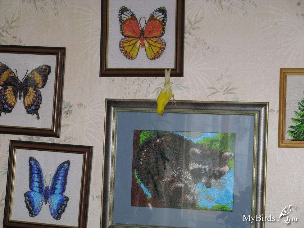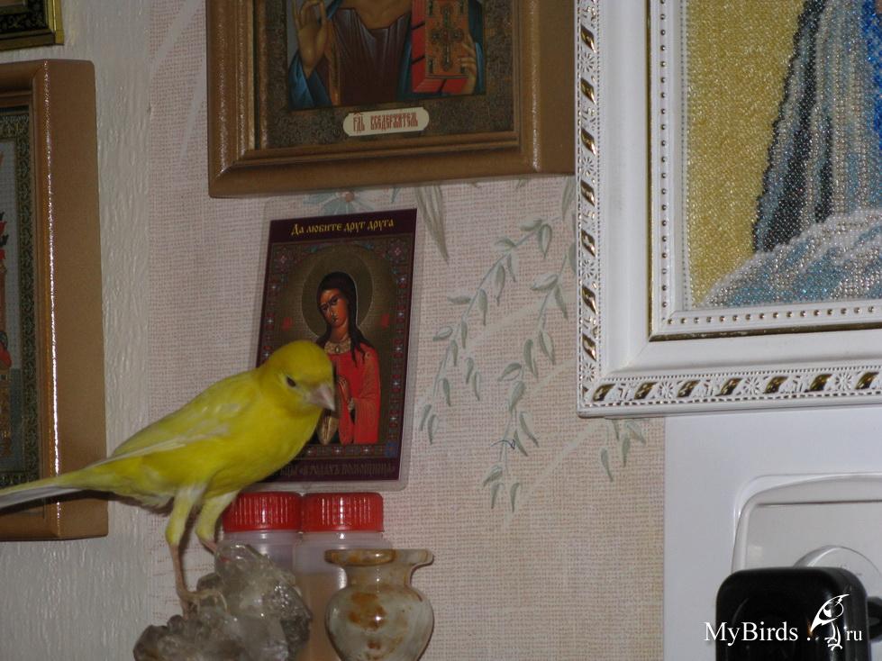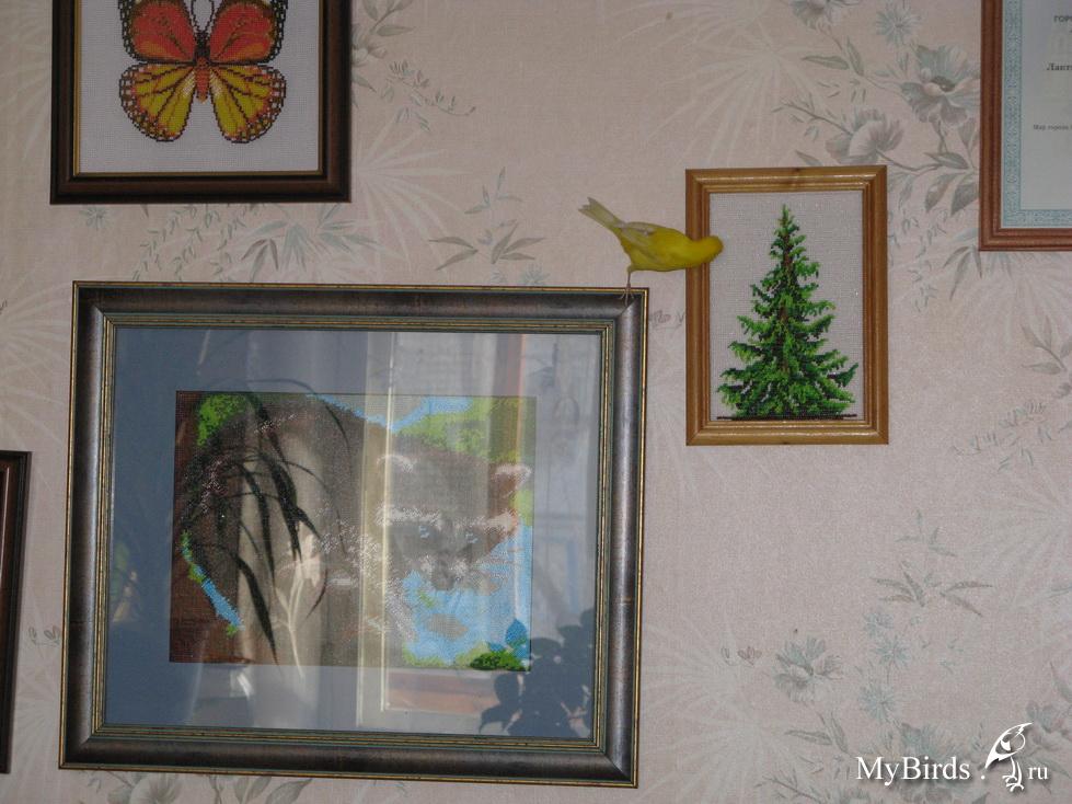 Juliett Опубликовано 9 апреля, 2009 #20 Опубликовано 9 апреля, 2009 Вот что бывает с непослушными канарейками! Они попадают в старые рваные сачки.Это Мультик отправился на прогулку. Очень быстро захотел домой, но никак не мог найти дверцу. А долго оставлять клетку открытой я не могла, т.к. там есть и другие обитатели. Пришлось ловить. Вообще его похождения сняты на видео, в том числе как он поет дуэтом со своим отцом.А вот в какой позе любит сидеть Шляп. Частенько его застаю в такой "угловой" позиции.