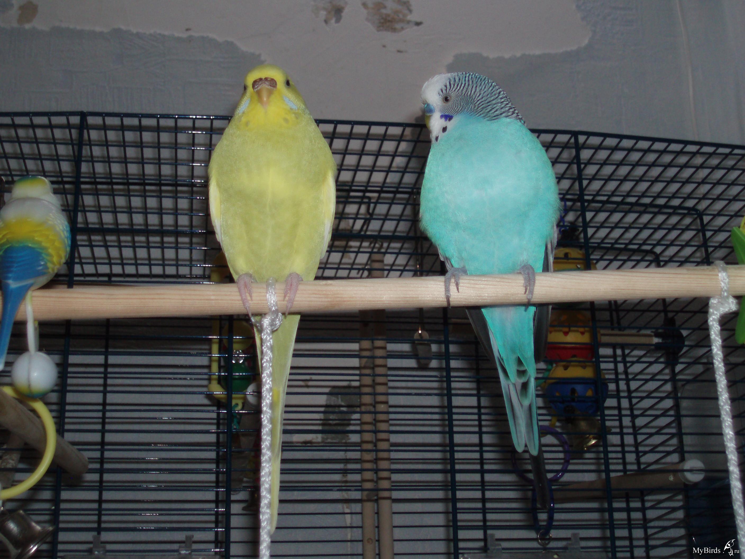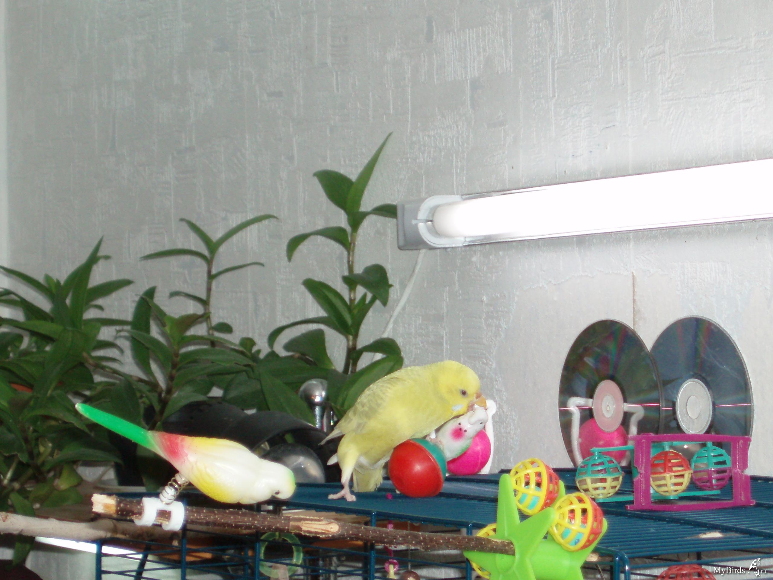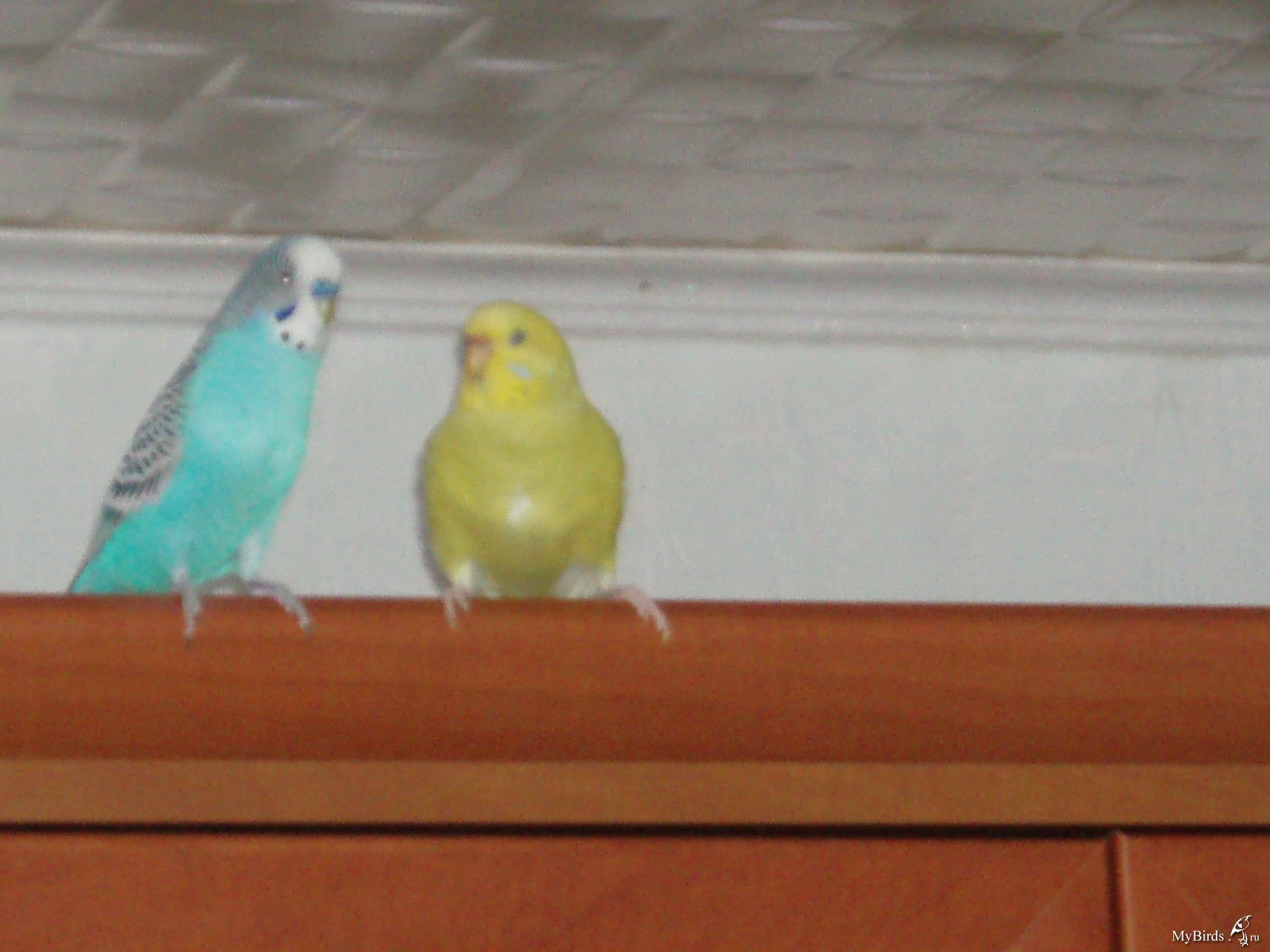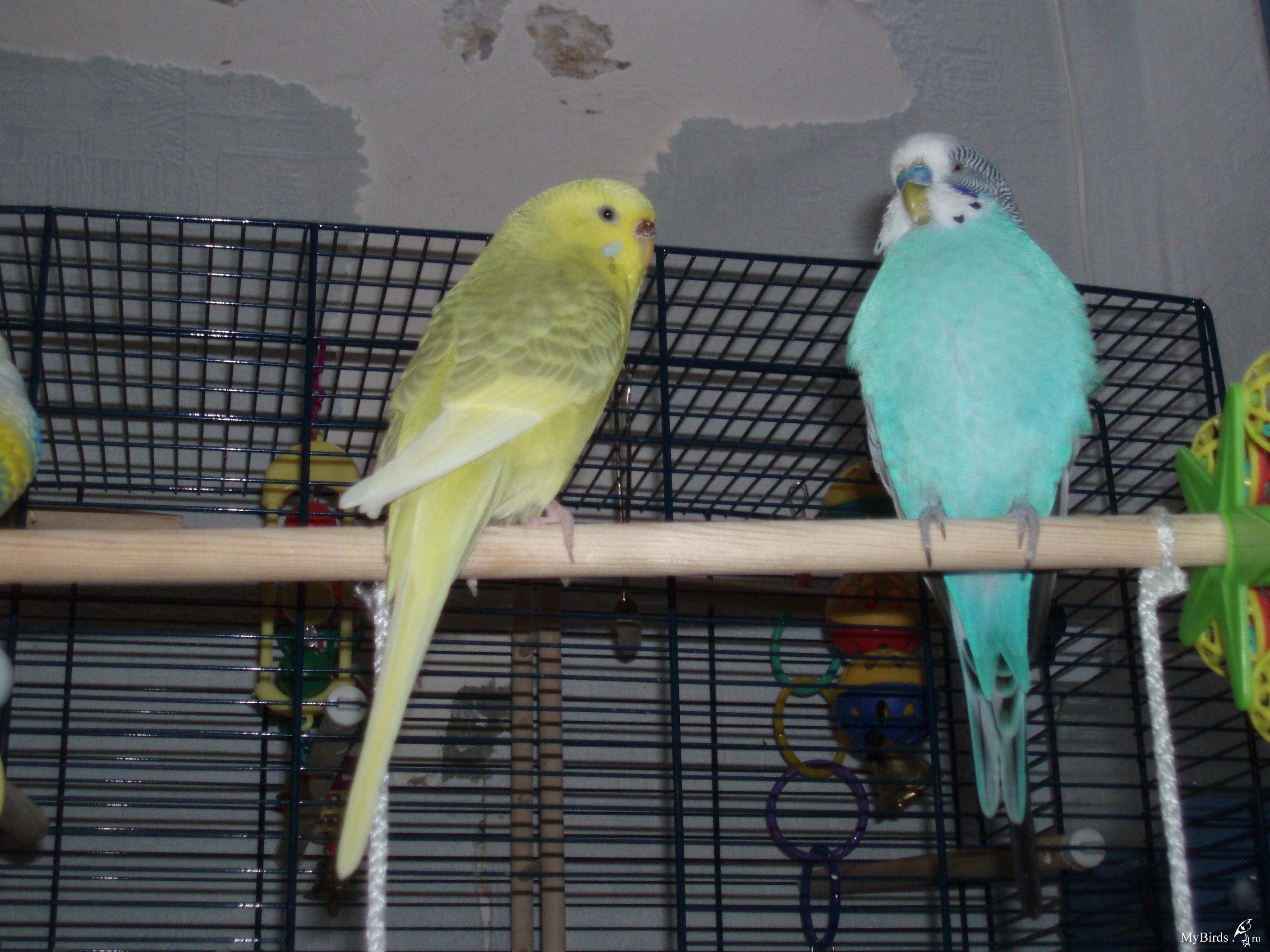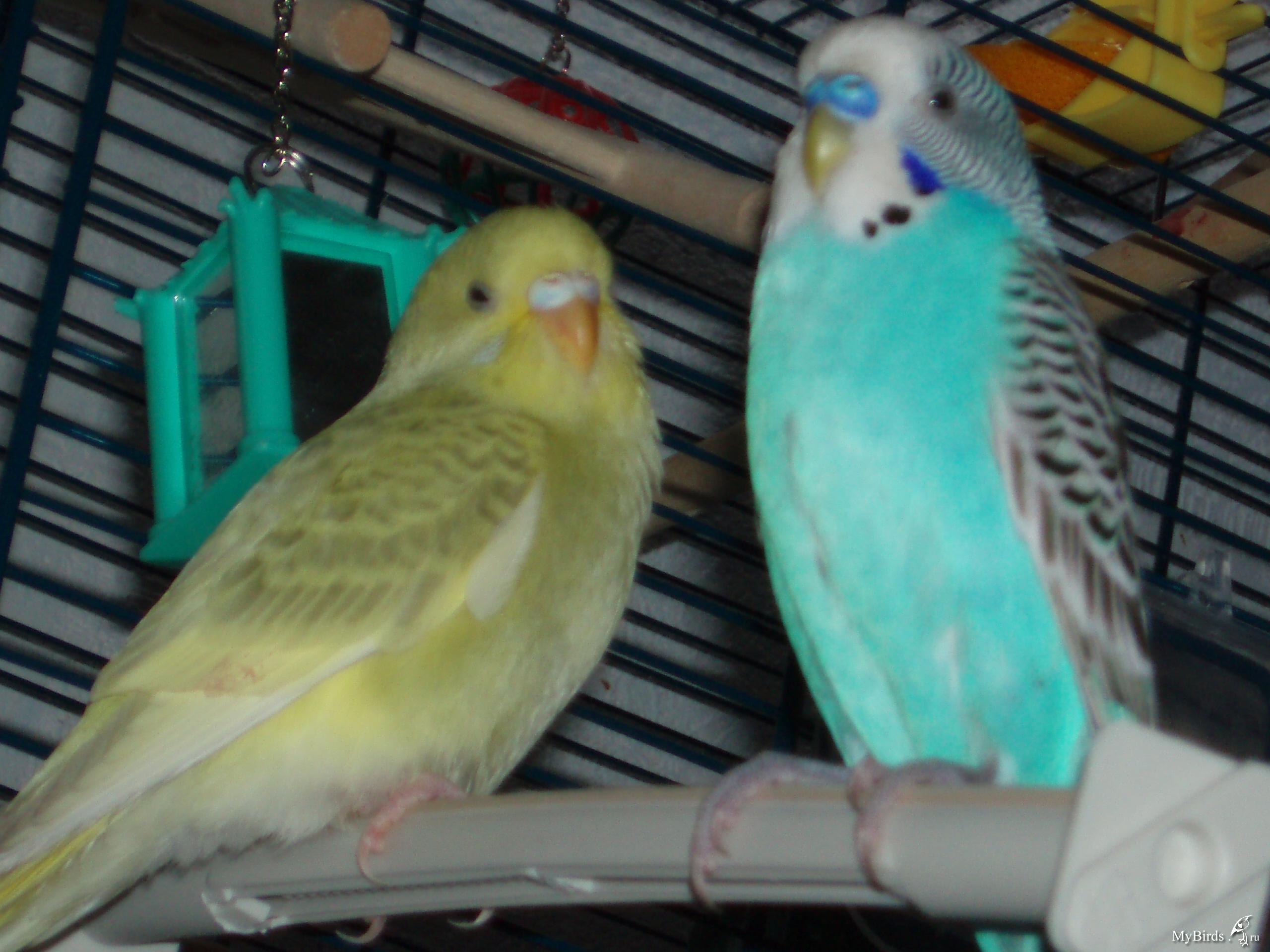 А мои Вася с Люсей, пока еще не подружились. Люся опасается Василька, потому что он глупыш и малявка. Васька все время скачет вокруг нее, стремится быть поближе, при этом все время налетая на Люську и сшибая ее с жердочки. Люсьена у нас дама солидная, ей уже 9 месяцев, а тут вокруг летает какой-то Несолидный :pilot2::slap: , поклевать толком зернышки не дает :dont: и полюбоваться перед зеркалом на свою неземную красоту! :spruce_up: