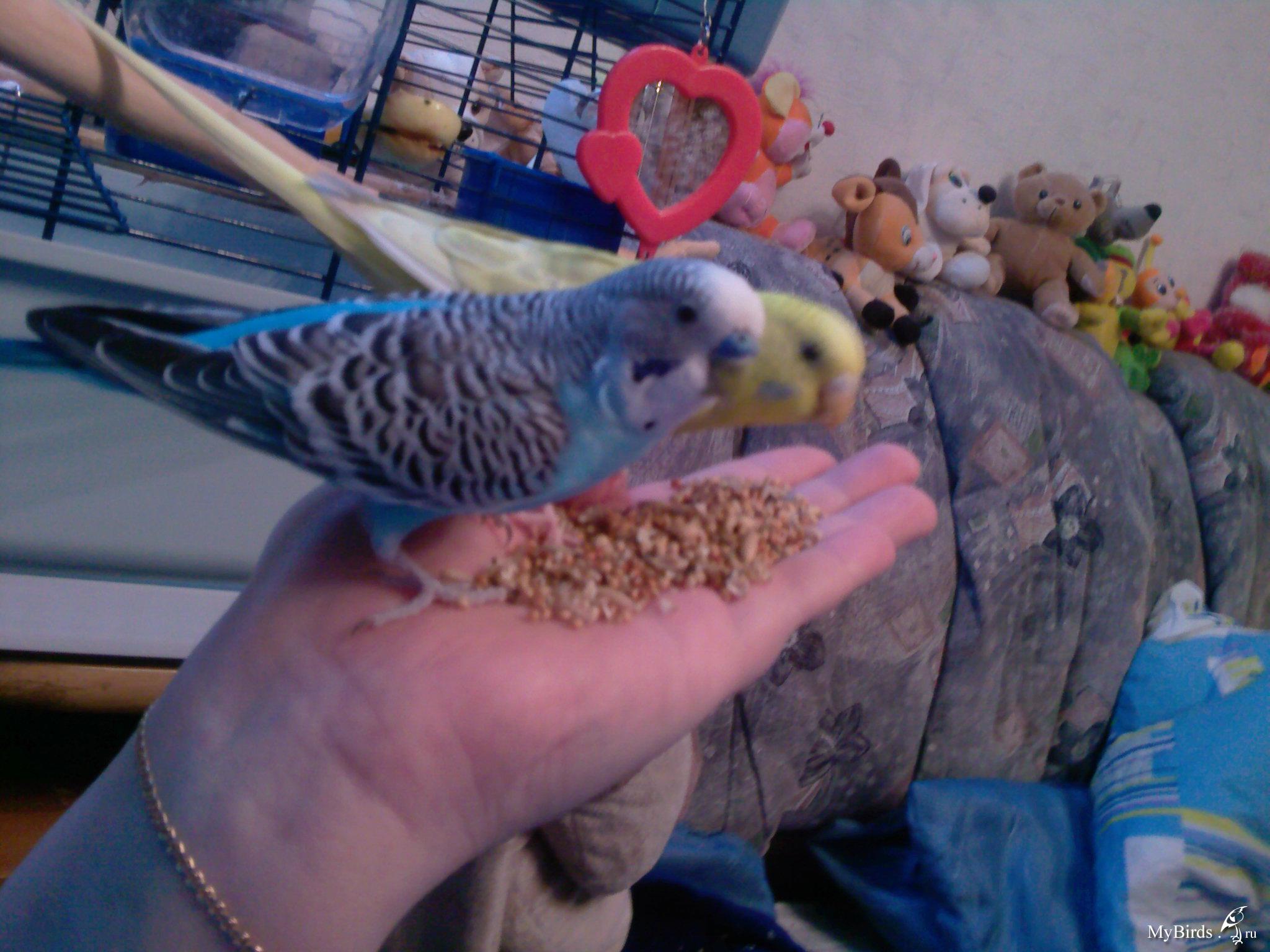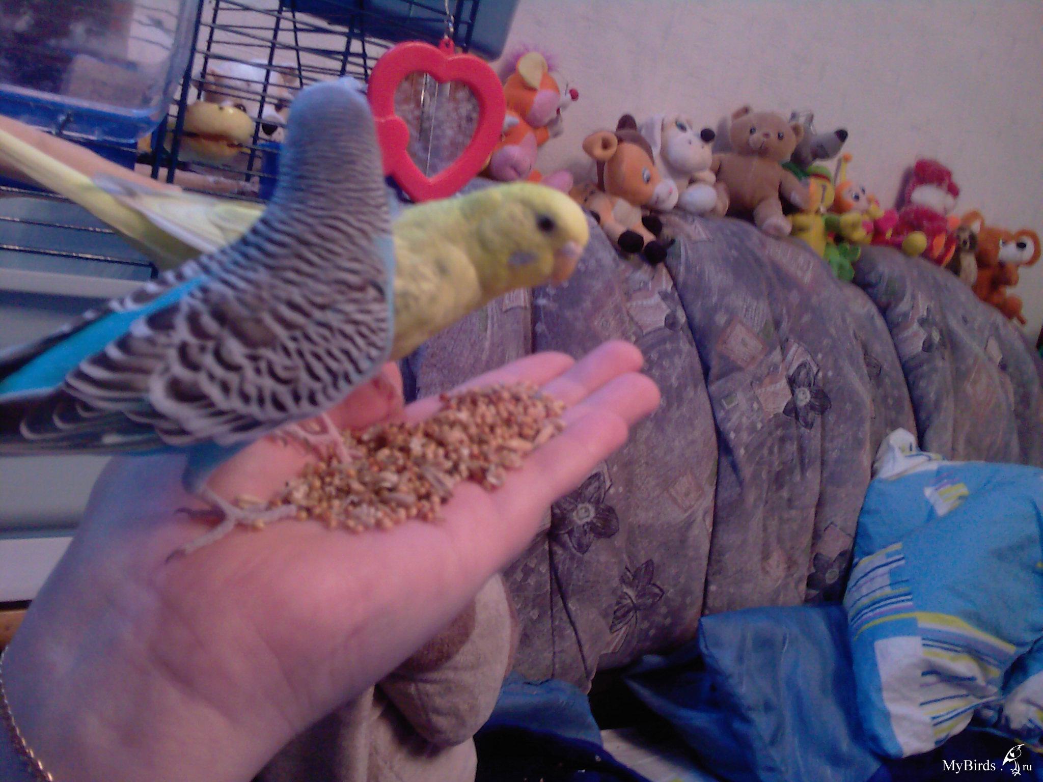 А Шустрик сегодня лапкой на руку встал :yahoo: Правда перед этим, проверил клювом, не опасно ли это :crazy: