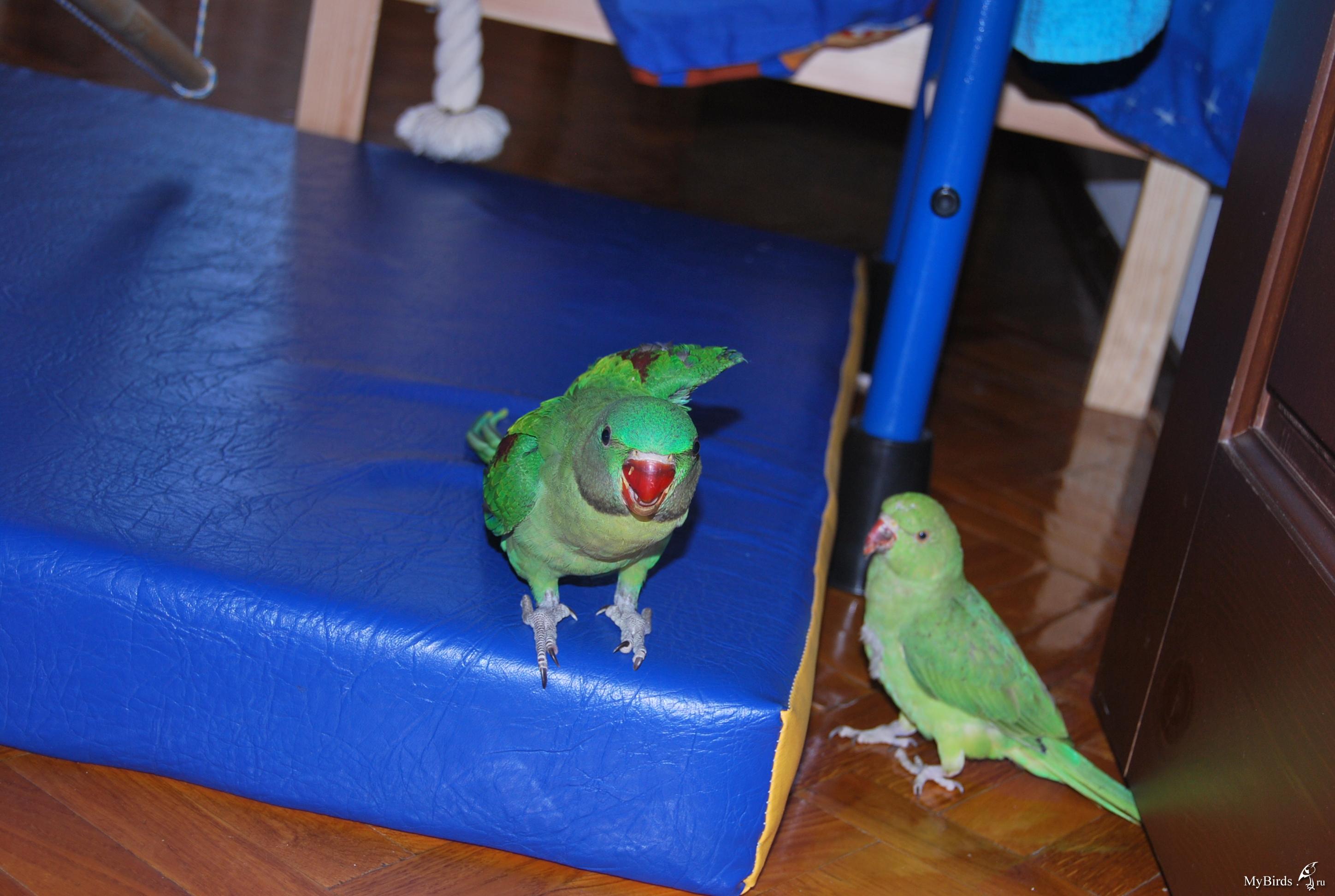 Зеленкин наш каика просто терпит... хотя каждый день на клетку к нему прилетает... А вот каик к нему сильно привязался.. Если Зеленкин вылетает из комнаты, то Лопик начинает жутко кричать, звать его... Даже если Зеленкин просто по дну клетки ходит-бродит и ковыряется в помоях, а каик его не видит из-за бортиков у клетки, тоже кричать и звать начинает...