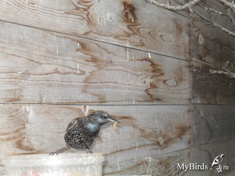 ESTET Опубликовано 12 декабря, 2014 #389 Опубликовано 12 декабря, 2014 Здравствуйте. Ваш сайт нашёл ещё весной, когда обзавёлся незапланированным питомцем (25.06.2014 выгуливал собаку и услышал-увидел как сороки напали на скворцов , а внизу возле тополя на земле под забором сидел ещё бесхвостый птенец ). Птенца подобрал (потом читал советы что нужно оставлять, но рядом с тем местом через пару дней обнаружил мёртвую птицу) , первая фотосессия : Рацион птица составляли каша пшённая+вареное яйцо , из деликатесов мухи. Жил в импровизированной клетке из пластмассовых ящиков на застеклённом балконе. С детства замечена любовь к купанию : Со временем был захвачен весь балкон с соответствующими последствиями, спал птиц в основном на бельевой верёвке, в питании добавились земляные черви (этому аристократу их нужно было подавать только в мелко нарезанном виде) и пару раз крупная саранча с дачи (вот надо было сфотографировать этого удава , заглатывал целиком). В качестве витаминной добавки употреблял мелко нарезанные стрелки чеснока. Личинок майского жука не очень уважал, да и после их теребения об землю там оставались одни шкурки. Со временем птиц был переселён в комнату (вместе с клеткой) . Так как смастерить нормальную клетку не удалось, пришлось за недорого купить бушную клетку 45*30*50 (со слов хозяина попугай смылся и она б.у. меньше месяца). Для переселения в новую клетку достаточно было переставить кормушку (крышечка от кофе в виде котомиски). На ночь клетка с обитателем выносилась на улицу и накрывалась "одеялом". Червей умудрялся заглатывать целиком, даже больших выползков, но однажды во время трапезы был напуган нехорошим человеком и метался в клетке с полупроглоченным червяком. Теперь их не признаёт (червей). Иногда приносил ему муравьёв их яйца. В качестве витаминов ест семена крапивы (на зиму заготовлено). Самое любимое лакомство - кузнечики из парка. Занятого кузнечиком птица получалось даже погладить , а так он ручной, но любит сидеть на руке или плече и кусать за ухо, но если поймать (пару раз проделывалось), то сильно ругается и кусается. Сейчас рацион следующий : яйцо вареное (со скорлупой) + каша пшённая намешивается и половина этой смеси перемешивается с мелко нарезанным куриным отварным мясом и тёртой морковью на один день, а вторая половина намешивается уже на следующий день . Мелок для птиц он не грызёт, ему интереснее проволочка для привязывания мелка. Сейчас понемногу крошу мелок и скармливаю птицу. Песок не давал, так как нигде про него не пишут , но в продаже он есть , посему намыл и прожарил речного песка , но птиц плюётся и не ест еду в этом песке. Купил пакетик песка (с минералами и костной мукой), по немножку ест, но я там песка не заметил, если честно. В сентябре перелинял, из коричневого стал пятнистым , а главное наконец то вырос нармальный хвост (прежний уж очень сильно поизносился в клетке). После линьки ему стало проще летать после водных процедур (купался в лотке с водой поставленном рядом с клеткой выплёскивая воду всю до капли), раньше он мокрым не летал , видать стало меньше пуха (хотя недавно опять понемногу стал линять и после купания в лотке установленном в ванной до клетки добирается пешком). Режим дня : 12.30-13.30 полёты (кухня-спальня с передышками на плече или на двери);13.00 обед ; 17.00 ужин ; 20.10 второй лёгкий ужин ; 20.30 передислокация клетки