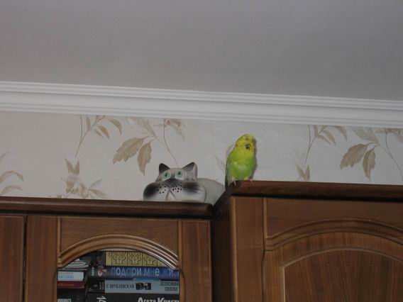 Goscha Опубликовано 7 марта, 2006 #43 Опубликовано 7 марта, 2006 Уже почти месяц живёт у меня волнистик Гоша. Продали мне его как 12-ти недельного, но кажется он старше. Это у меня первый попугай, да и вообще первая птица, так что я далеко не специалист . Кажется птичка у меня ни чем не болеет, ест хорошо, помёт нормальный, но ведёт себя странно. Просыпается достаточно рано (около семи), поест и сидит на одном месте, "песен" не поёт, по клетке не мечется. Часов в 9 я открываю клетку, но он может там ещё пару часов посидеть, а потом вылетит, перелетит на тумбочку в другой стороне комнаты и там посидит ещё несколько часов, подадут, так и яблочко съест или ещё чего. Может на ветку над клеткой перелететь и там посидеть. При этом чирикает крайне редко, но если на него найдет, то может не дать поговорить по телефону, а как трубку положишь, опять замолчит Игрушки в клетке и за её пределами игнорирует. К вечеру сам залетает в клетку, поест и опять сидит. Иногда попрыгает, для приличия, по клетке немного и на свою любимую жёрдочку спать. Я с ним постоянно разговариваю, но пока он молчит. Может быть у меня чех? Говорят они такие тормозные. Ростом он от головы до конца хвоста примерно 22 сантиметра. Gavrysha, спасибо. Вот ещё несколько фоток: