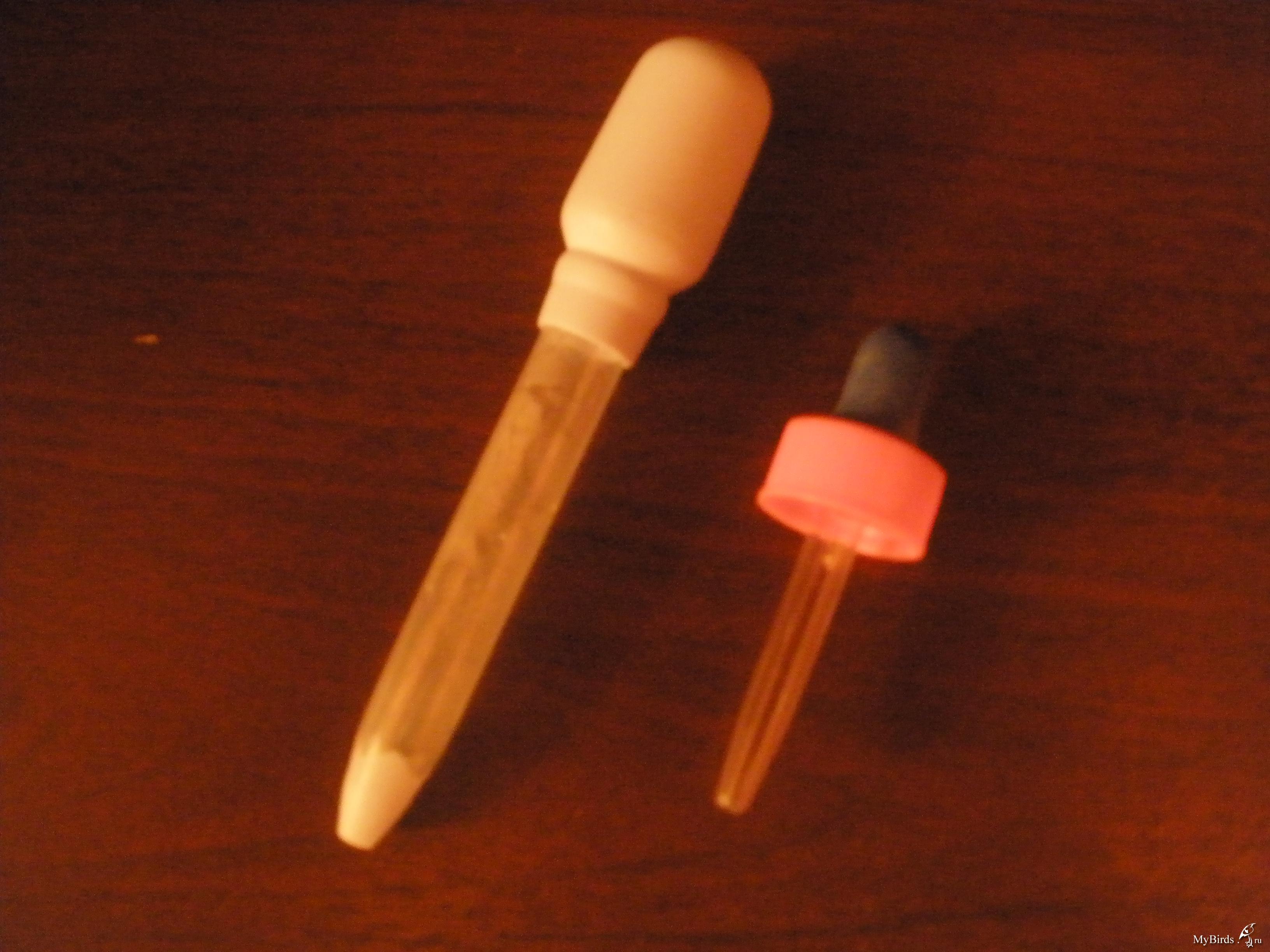 марина.ку Опубликовано 2 октября, 2009 Автор #22 Опубликовано 2 октября, 2009 (изменено) Заранее готовлюсь к появлению малышей.Думаю, мне в этот раз тоже предстоит их выкармливать, так как моя пара раньше времени начинает заново нестись.Вчера обошла все аптеки в поисках больших пипеток, с большой дырочкой. Многие кормят с помощью шприца, но мне не очень удобно. Каша набирается совсем жидкая, от этого у малышей очень жидкий помёт и подстилка всегда мокрая.Через шприц (там очень маленькая дырочка) невозможно набрать более густую кашу, да и яйцо, натёртое на мелкой терке.В прошлом году я кормила через большую пластмассовую пипетку. Очень удобно.Она у меня уже испортилась. Покупала её в витаминах Джунгли беби для грудничков. Но сейчас таких витамин не найду. Есть ещё витамины Мультитабс, но там пипетка с очень круглым концом, в клювик не зайдёт.Вот купила две пипетки одна маленькая на первое время, а другая для более старших малышей. В маленькой пипетки размер дырочки немножко больше чем у шприца. Думаю будет удобно кормить.Большая-это пипетка дозатор для грудничков. Изменено 2 октября, 2009 пользователем марина.ку