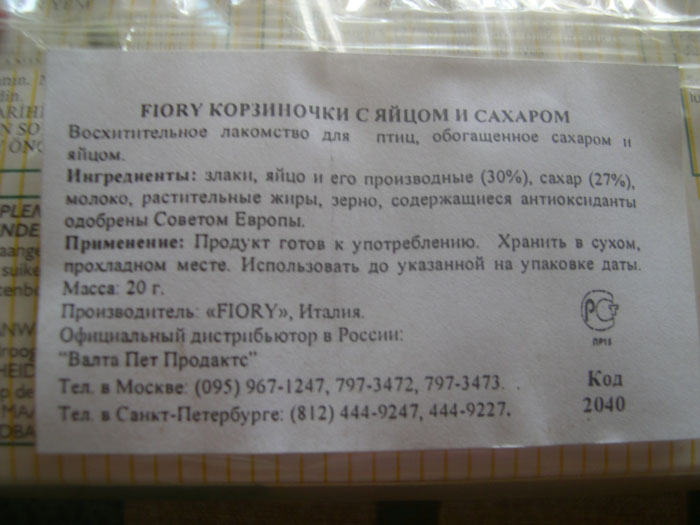 Прошу прощения, что влезла в эту тему...Может, что упустила прочитать.. Но хочу узнать вот что. В продаже имеются некие "бисквиты для птиц", кажется, фирмы Fiory (или Padovan). Мы их ещё не пробовали. Всё не решаюсь их купить. Пользуются ли у птиц эти лакомства спросом? Кто-нибудь покупал их для своих птичек? Нравятся ли им эти бисквиты? Заранее спасибо за ответ.