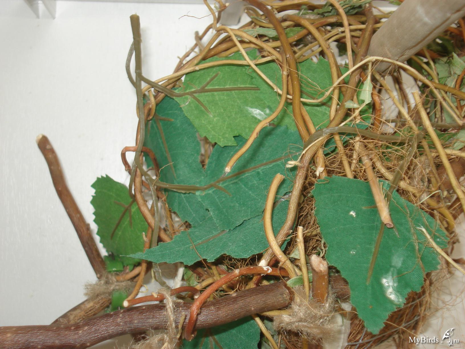 Конструкция была "лысая". Просто сетка внизу и сверху полукругом прикреплены веточки ивы. Забрала еще с дачи, летом из вольера, а сейчас решила повесить в боксе. С удивлением заметила не только активное строительство с помощью кокосового волокна и высушенной травы, но и вплетеные листья искусственной березы :newconfus: . Удивлена потому что я не пойму :idontno: , как самец умудрился отодрать 2 куска этой ветки, прикрепленной еще к тому же с противоположной стороны бокса. Я сама попробовала это сделать, у меня получилось с большим трудом. Где бокс сфотографирован снаружи издалека, видно что это довольно большие и крупнык ветки.