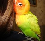 Очень смышленый малыш. Постановил, что "французский карман" - его дом, и теперь для осуществления "грязных нужд" выбирается наружу. Как только начинает суетиться, у меня уже наготове салфетка... все очень цивилизованно :) . С удовольствием хрустит сухими мюслями, но корм для неразлучников по-прежнему презирает. Но я и не настаиваю - разве в силах не баловать такого кавалера? :)