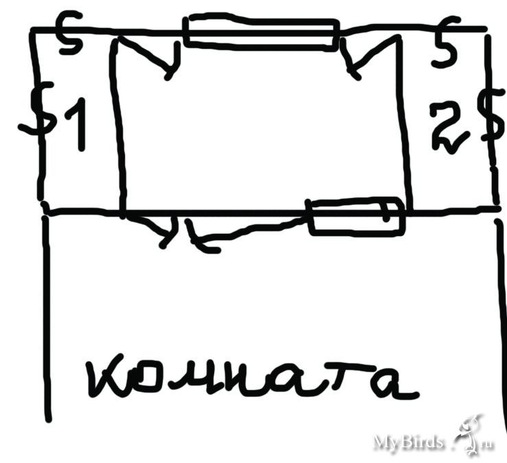 Между вольерами и разводным шкафом натянуты канаты сизалевые, присобачены поперечные палки (на держателях для шкафов) и подвешены всякие птичкины безделушки.
