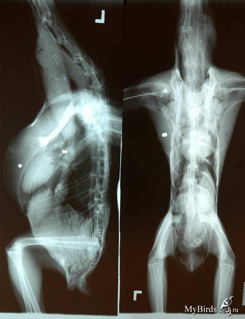 aleste Опубликовано 18 июля, 2010 Автор #84 Опубликовано 18 июля, 2010 С утра везем птичку на рентген, мне сказали что нужно сделать 2 проекции: дорсо-вентральная, птица на спине крылья раскрыты, и латеральная, птица на боку крылья отведены назад, ноги вытянуты вниз. С первой позой думаю справимся, а вот со второй ... даже незнаю как же ему отвести крылья назад, чтобы не дай бог не вывихнуть? Может Вы подскажете как птичку правильно держать во время рентгена. А может можно не отводить крылья назад? п.с. Как мне объяснили, снимки должны получиться примерно такими (это снимки не моей птички).