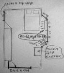 LANITA Опубликовано 31 августа, 2005 Автор #21 Опубликовано 31 августа, 2005 (изменено) А почему тогда нельзя использовать обычный масляный радиатор, для обогрева птицы? Он слишком сушит? Другой вопрос, нужно ли покупать для птиц разные перевозки, или можно сажать в одну? вот набросала план комнаты...по-моему единственное более-менее подходящее место для кондиционера. Так он не дует непосердственно на клетки. Изменено 31 августа, 2005 пользователем LANITA