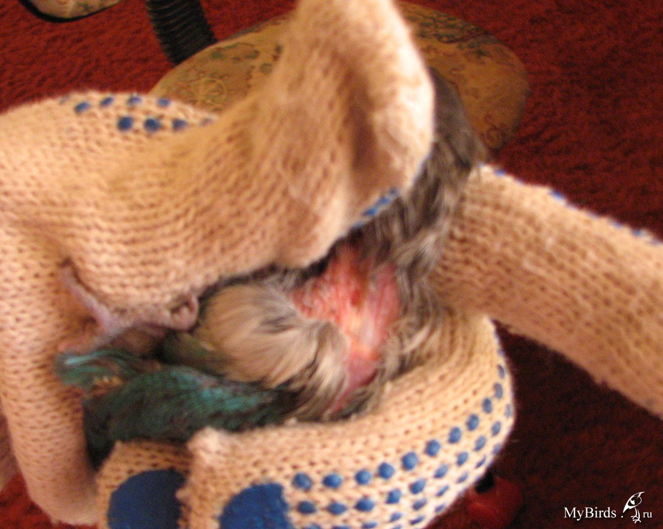 Опять осматривала птицу вчера, более внимательно. На месте ободраного корочки. под крыльями и везде под перьями все нормального цвета. А вот на шее между лопатками - если так можно сказать - капсула белого цвета (жировик или гнойник?) размером с 5 мм в свободном движении если потрогать. Бедный птиц...