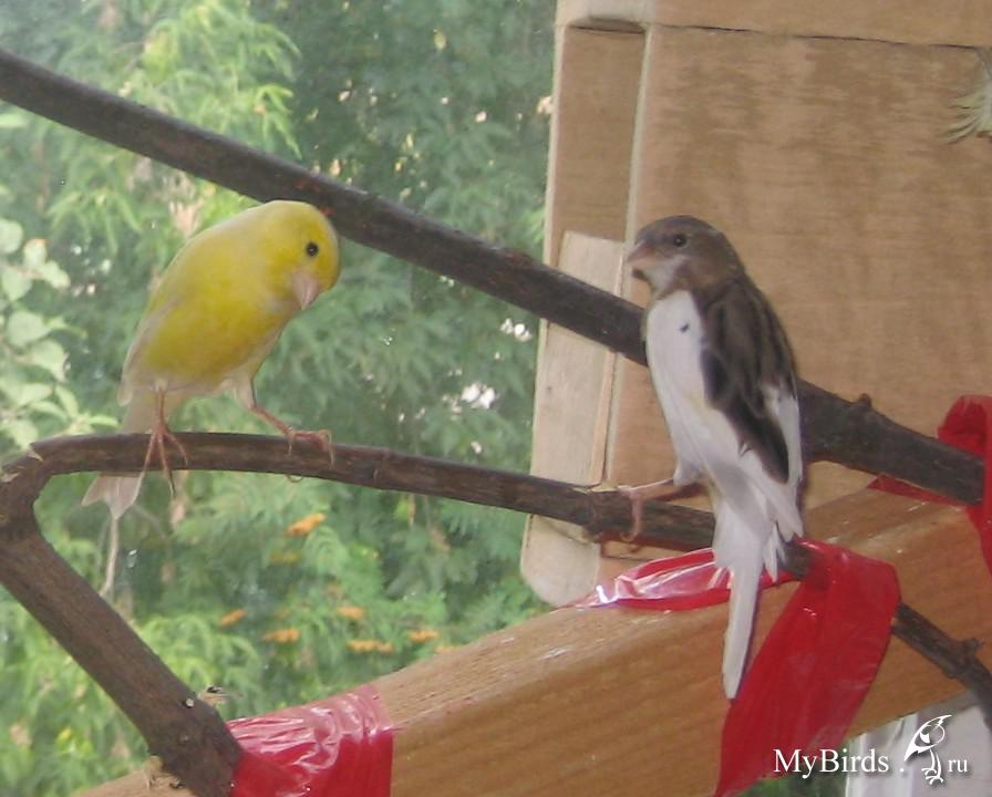 Fizalis Опубликовано 21 июля, 2010 #17 Опубликовано 21 июля, 2010 Ася77, про окрас написала вам в другой вашей теме. Держать пару вместе можно хоть все время, если не планируете обучать самца пению, они у вас не дерутся и самка не начала нести яйца безостановочно. У меня была вполне адекватная во всех планах пара, проблем не было. Но если самка начинает нестись и ее приходится останавливать, то обязательно рассаживать. Слила ваши темы и удалила лишнее. Если канарейки дерутся, то их надо некоторое время подержать в клетках, стоящих рядом, чтобы привыкли друг к другу. Если птицы, будучи ссажеными вместе, просто шипят друг на друга, то это - временное явление, пройдет через недельку, главное поставить 2 кормушки, чтобы птицы не мешали друг другу питаться. 1. как можно по поведению определить самца, у меня они оба чирикают, только он когда пытается у него перья под клювом надуваются, ище немного дольше как то чирикает.907732[/snapback] Если перья надувает на зобике, то самец, но можете временно разделить в разные комнаты и убедиться, что начал распеваться (детская песенка у меня в темке выложена в дневничках, а еще поищите тему "Песни наших канареек")